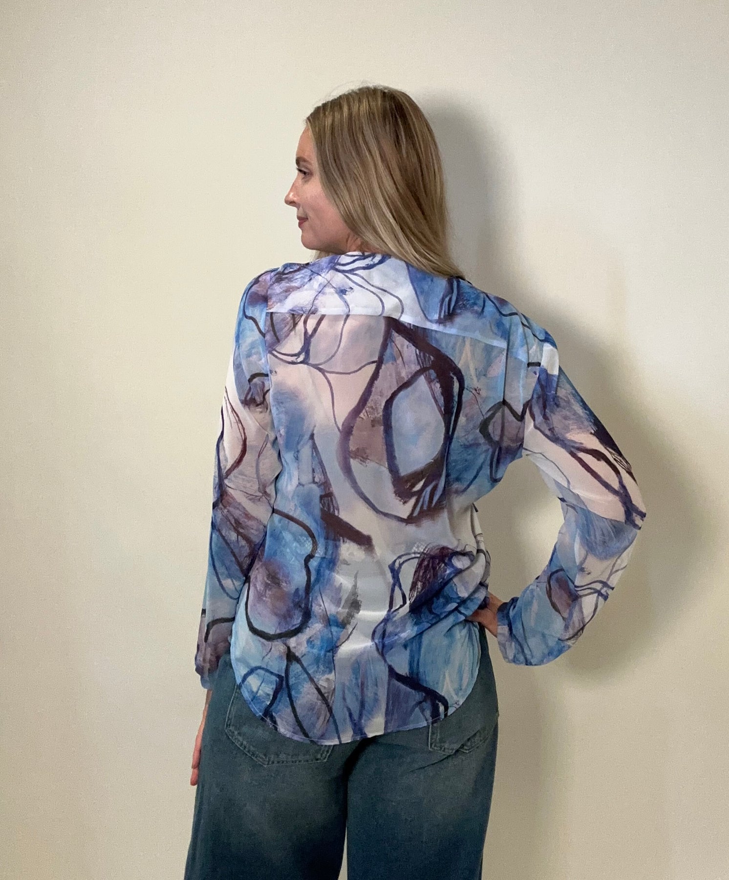 Periwinkle Floral Front Side Tie Top with V-Neck and Sleeves. Fabric: 100% Polyester
