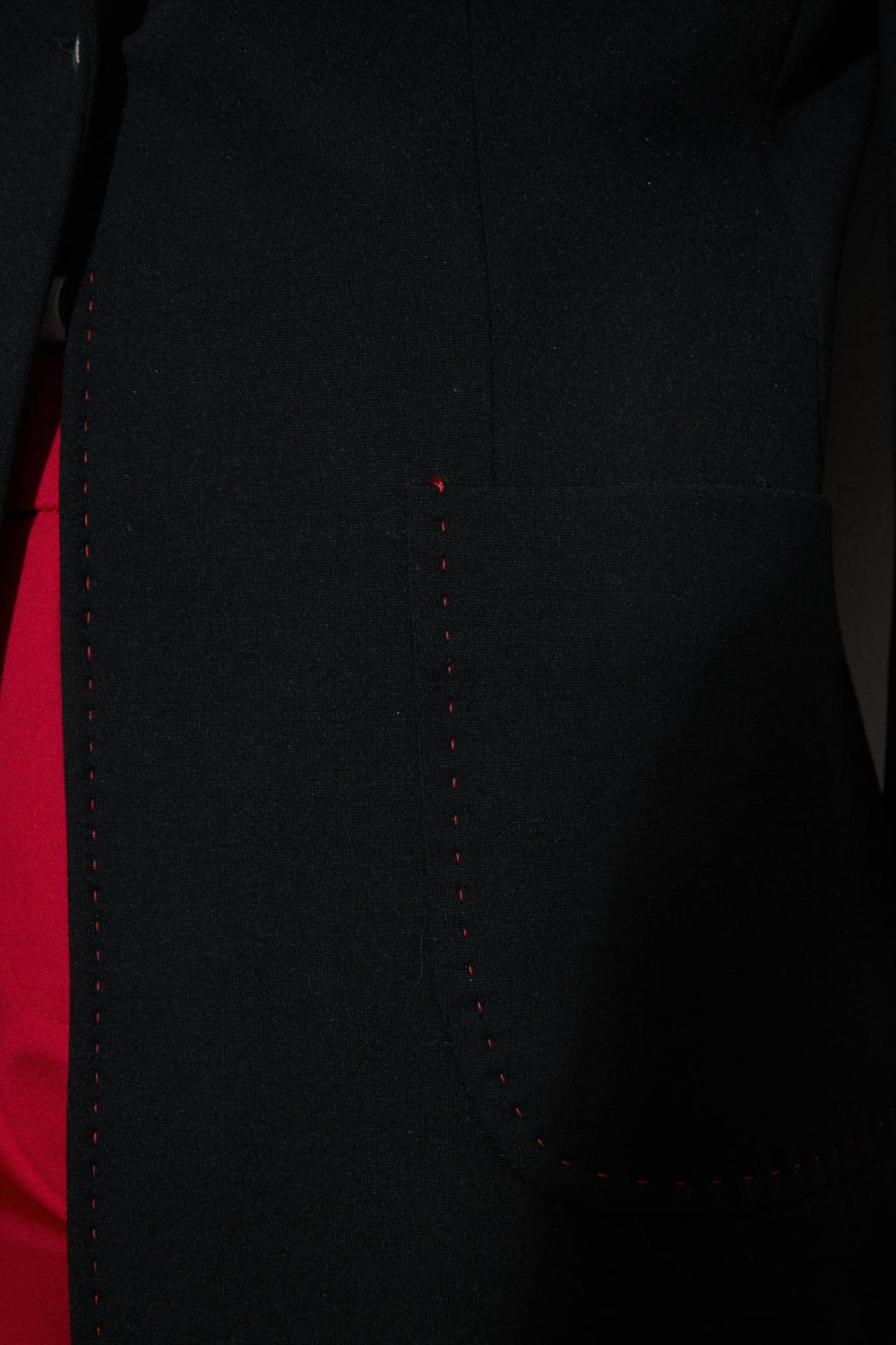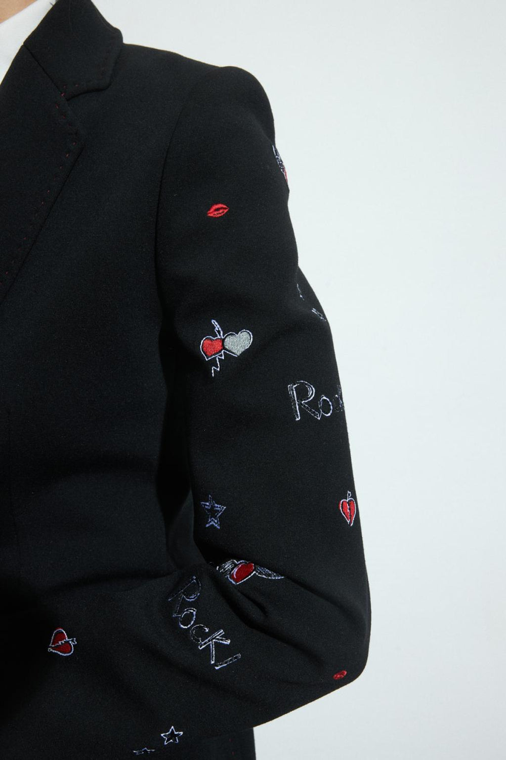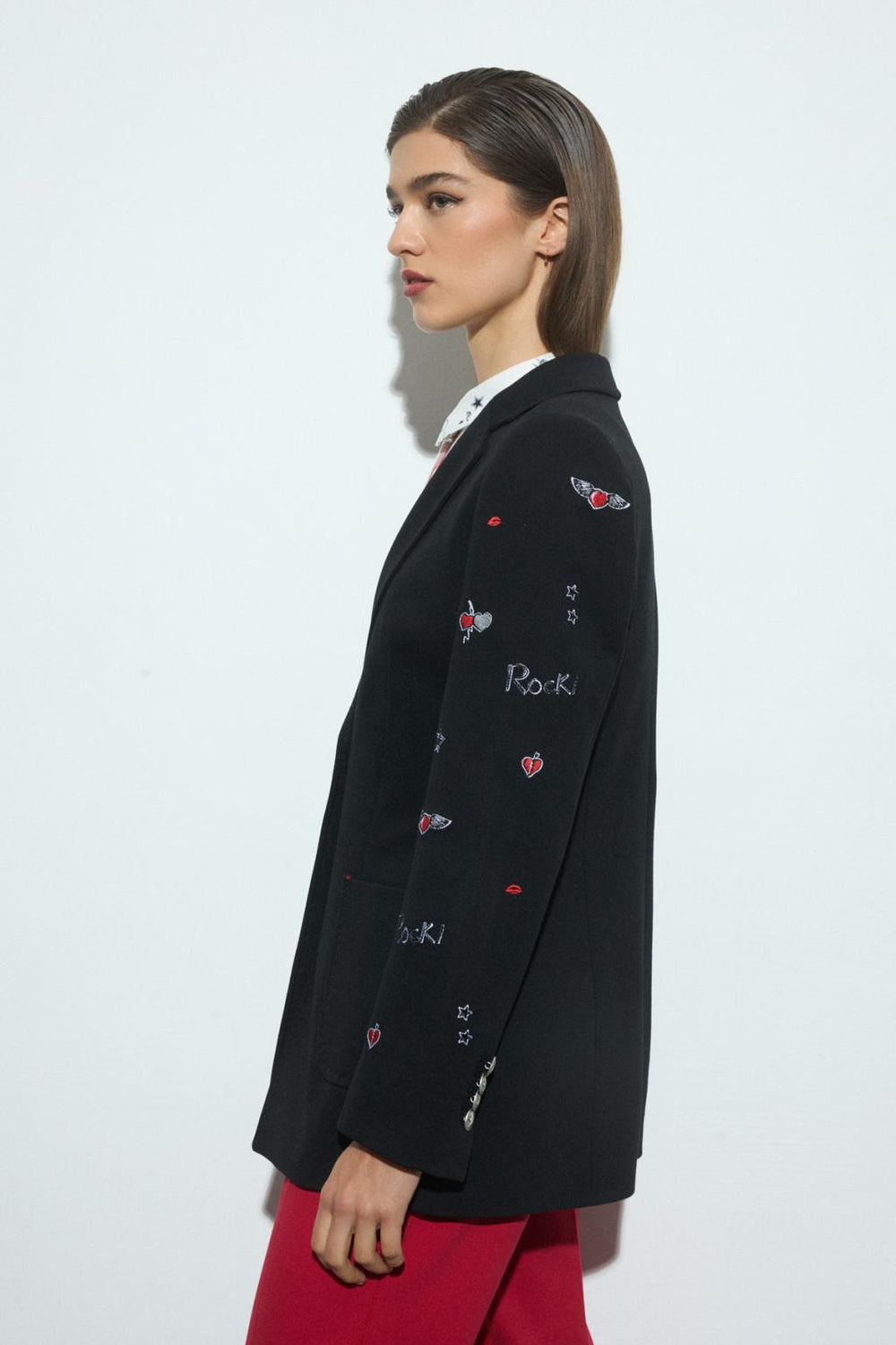 Long, plain blazer with embroidered rock-inspired details. Notched lapel collar with contrasting topstitching. Front closure with a jeweled button. Long sleeves with matching button closures. Straight hem. Front patch pockets with contrasting topstitching.