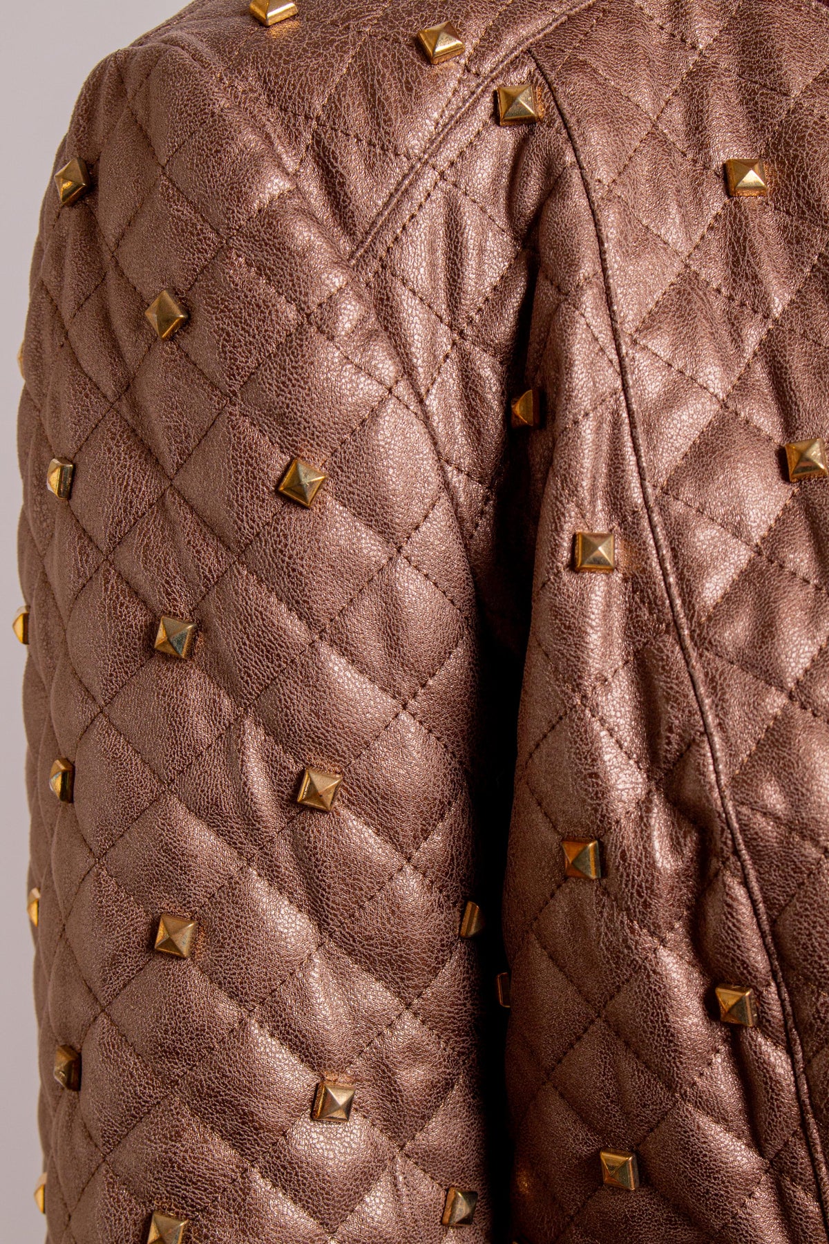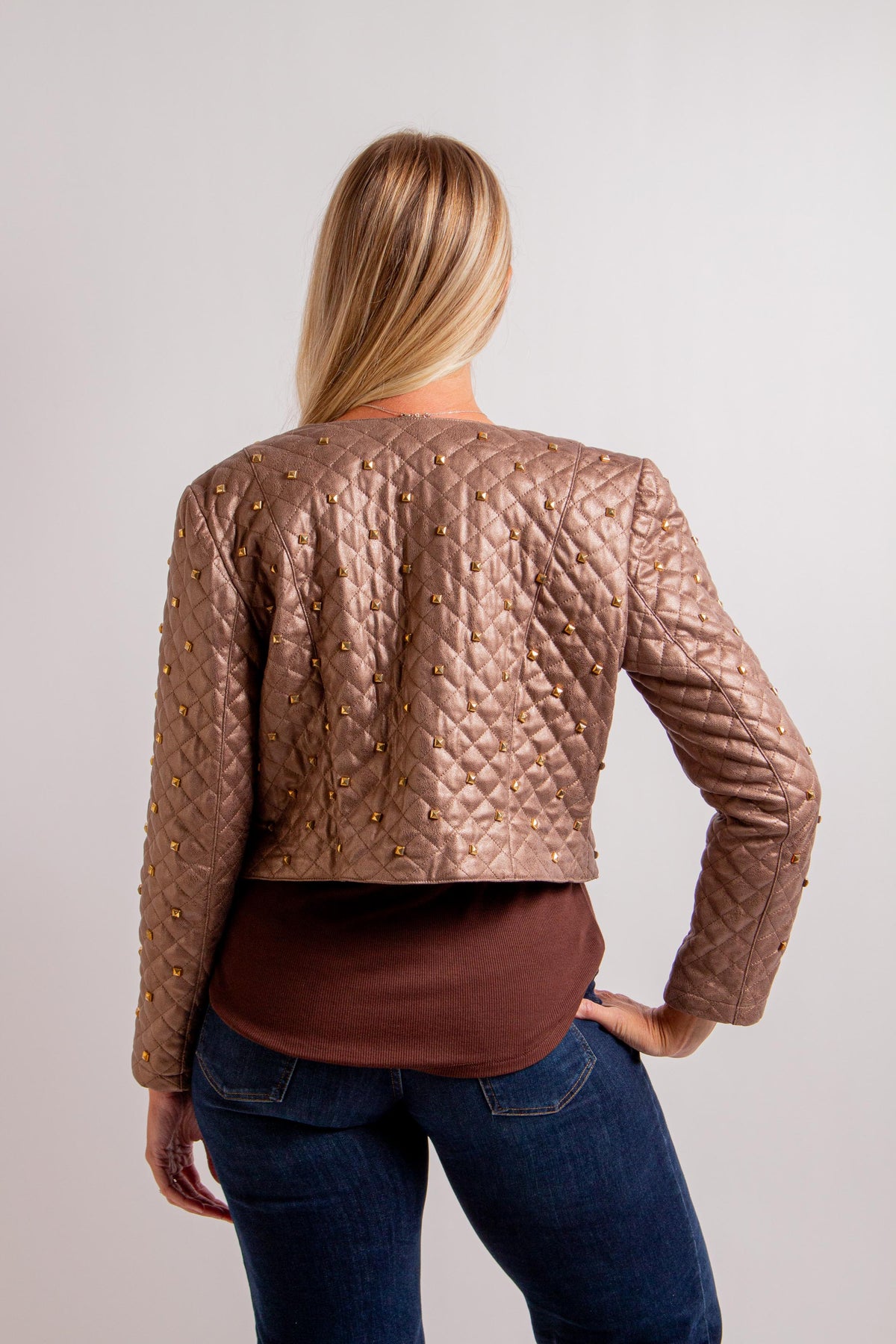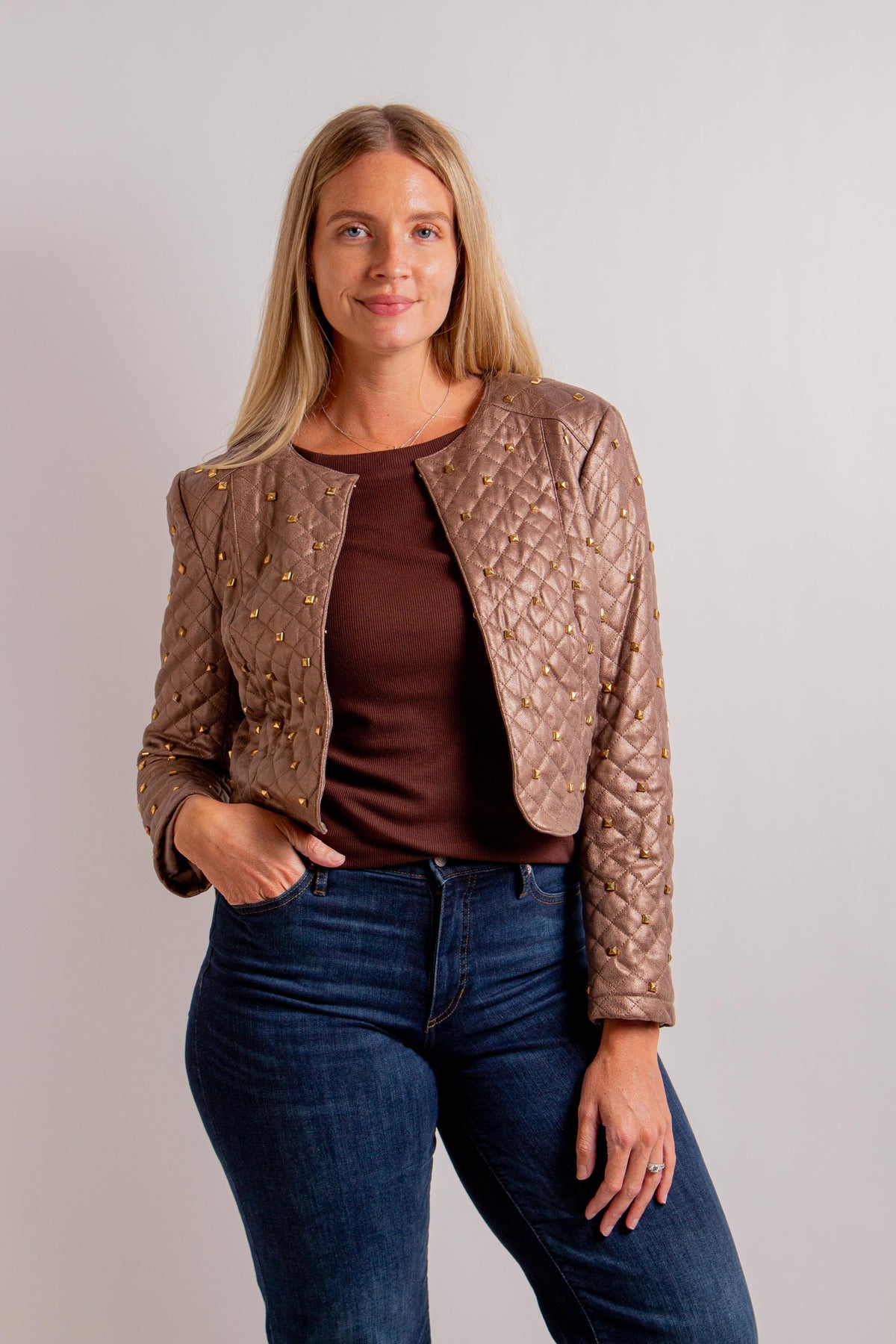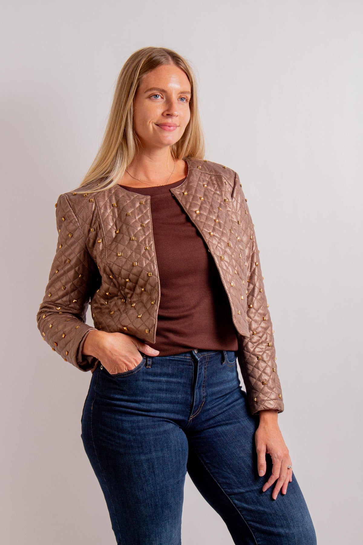 Brown Quilted Novelty Crop Jacket with Long Sleeves, Scoop Neck, Font Clip Closure and Square Metal Pyramid Studs Design.