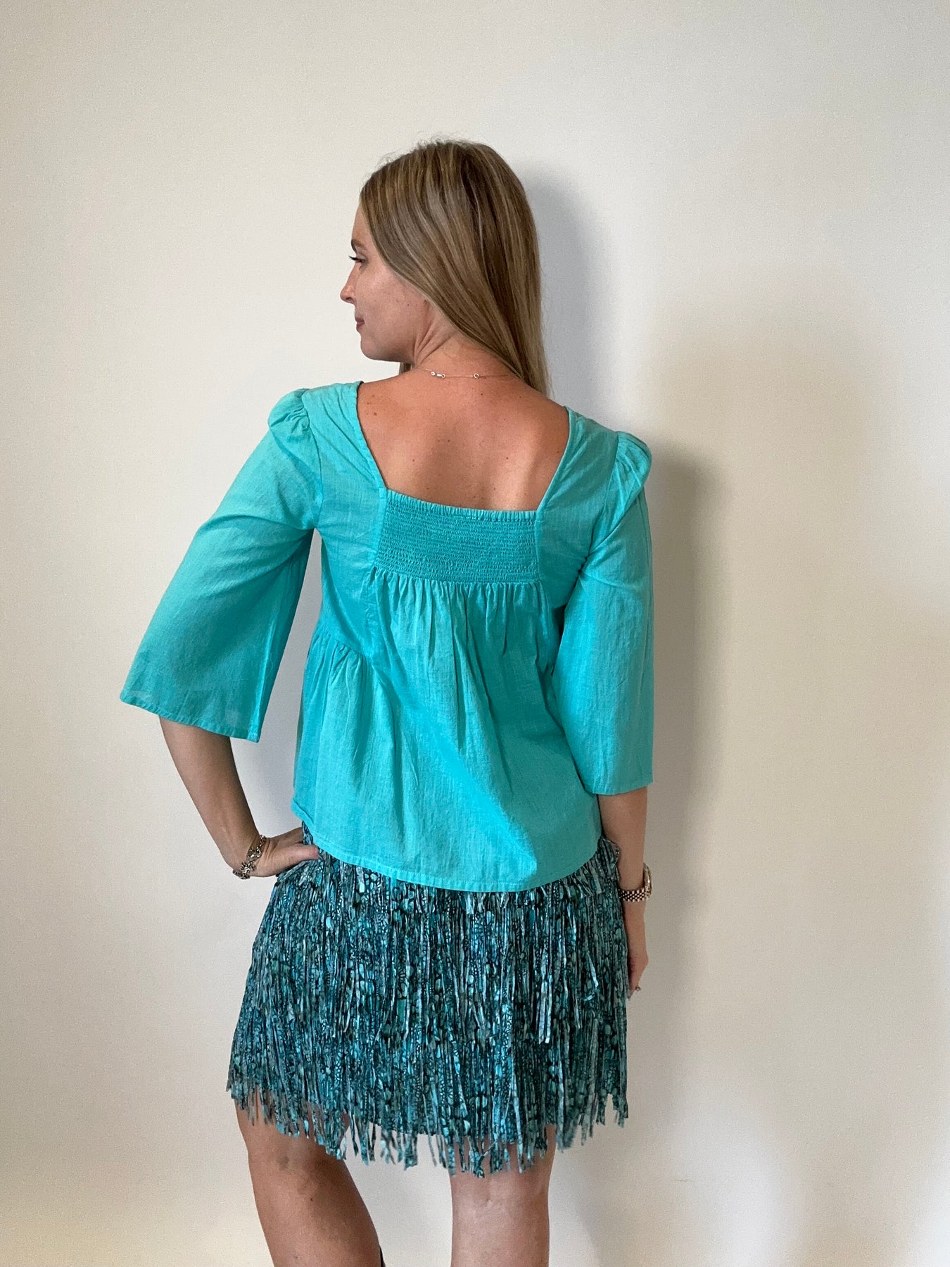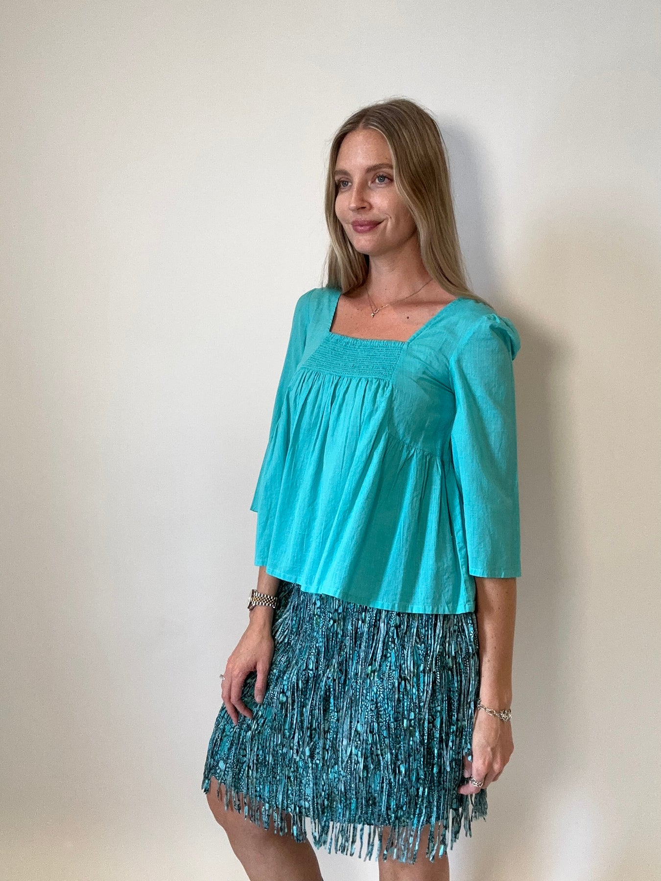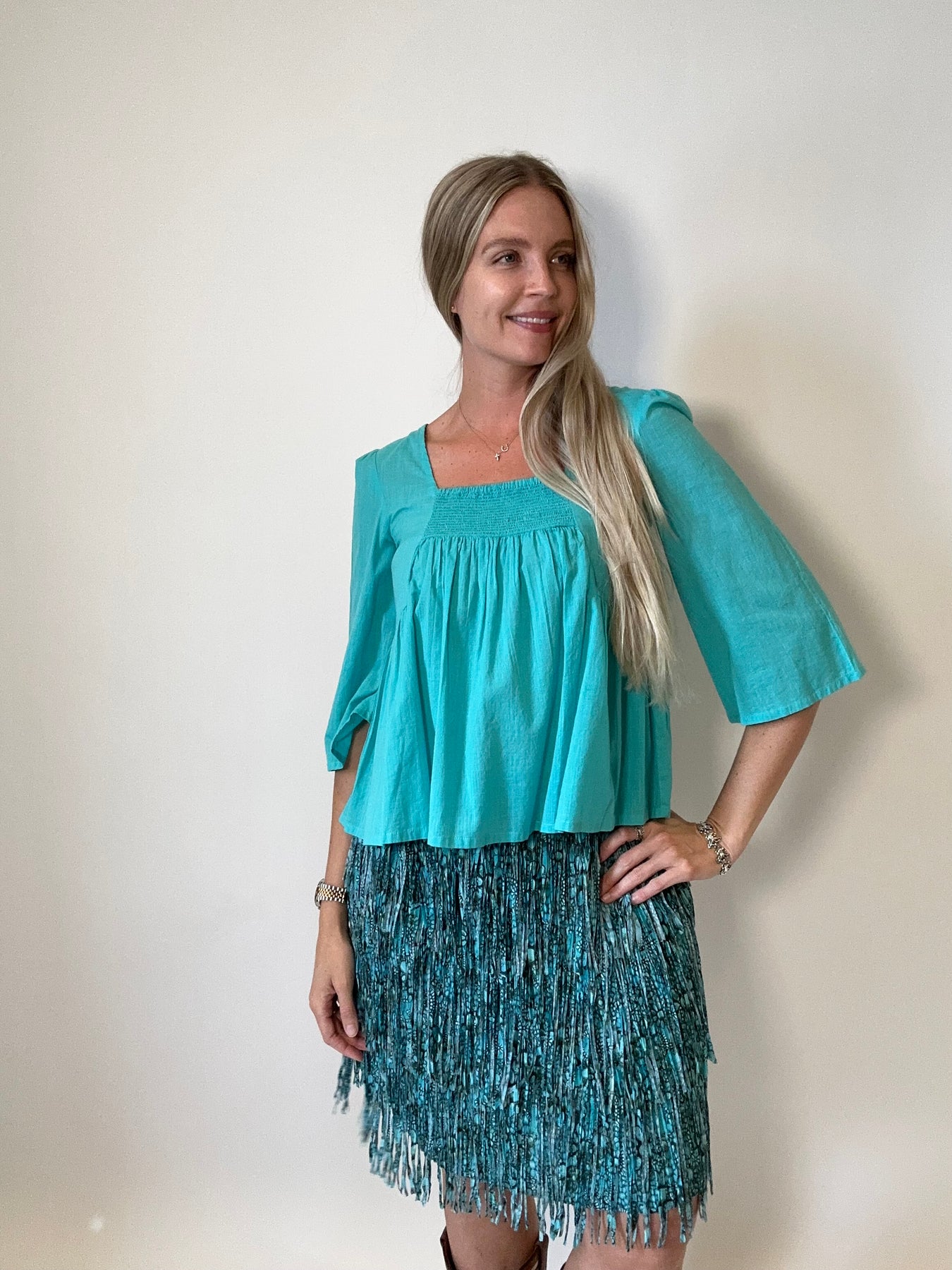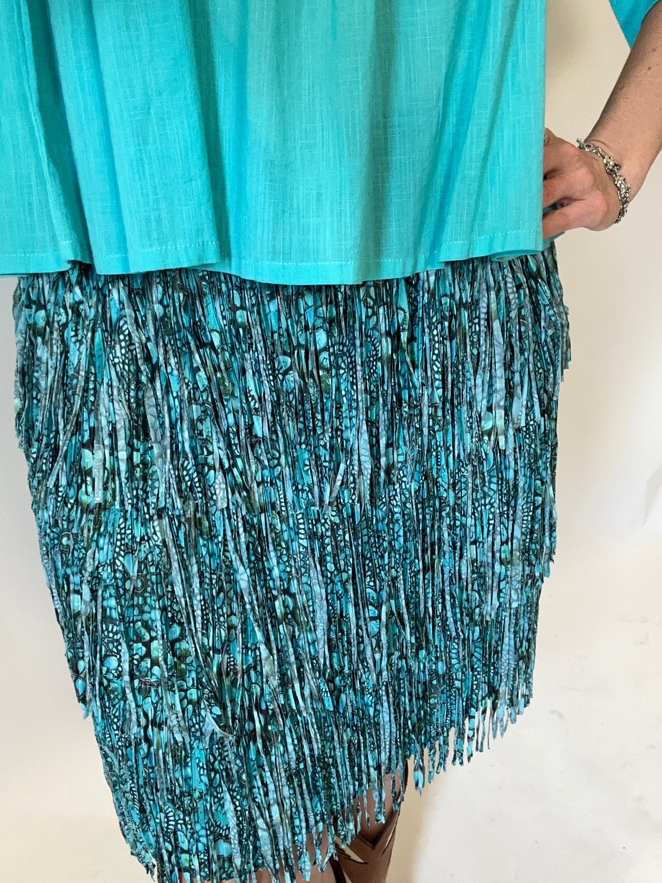 Turquoise Floral Midi Fringe Skirt