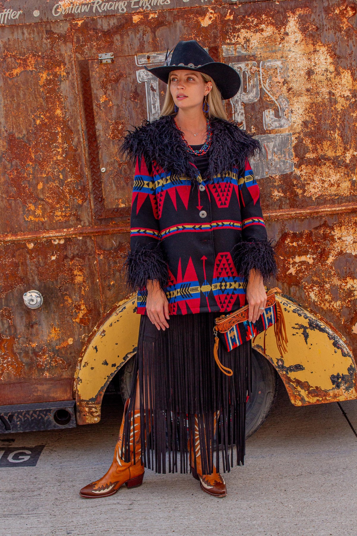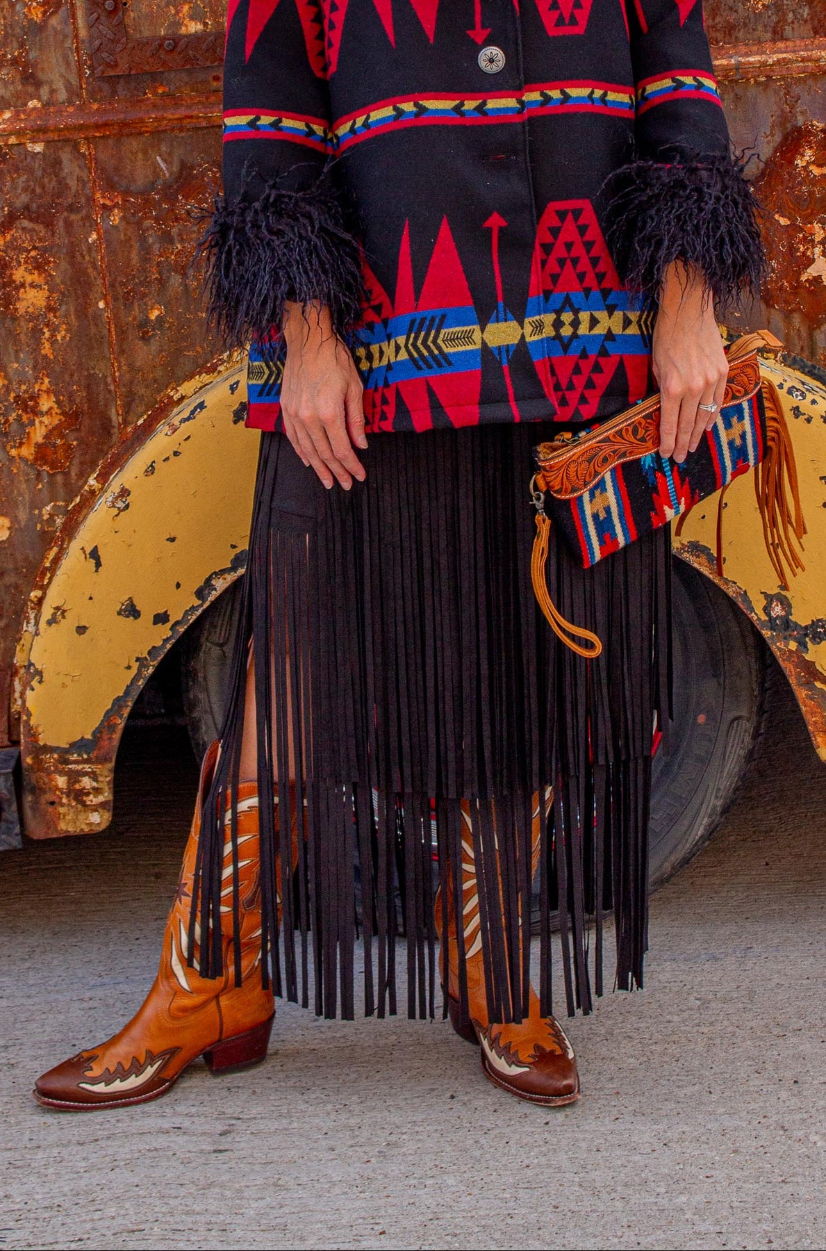 Solid Black Midi Fringe Skirt with Long Fringe Detail. Fabric: 90% Polyester, 10% Elastane