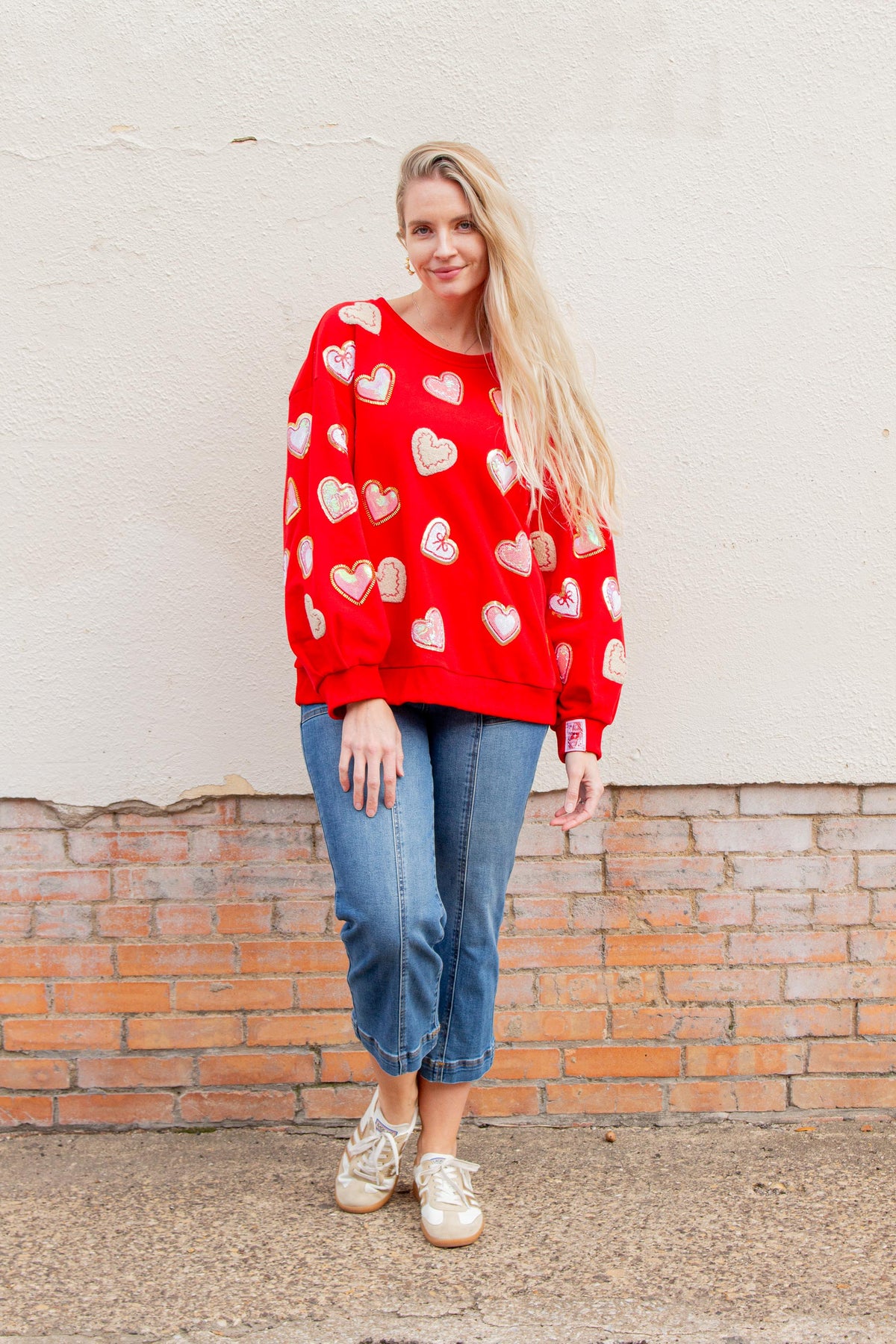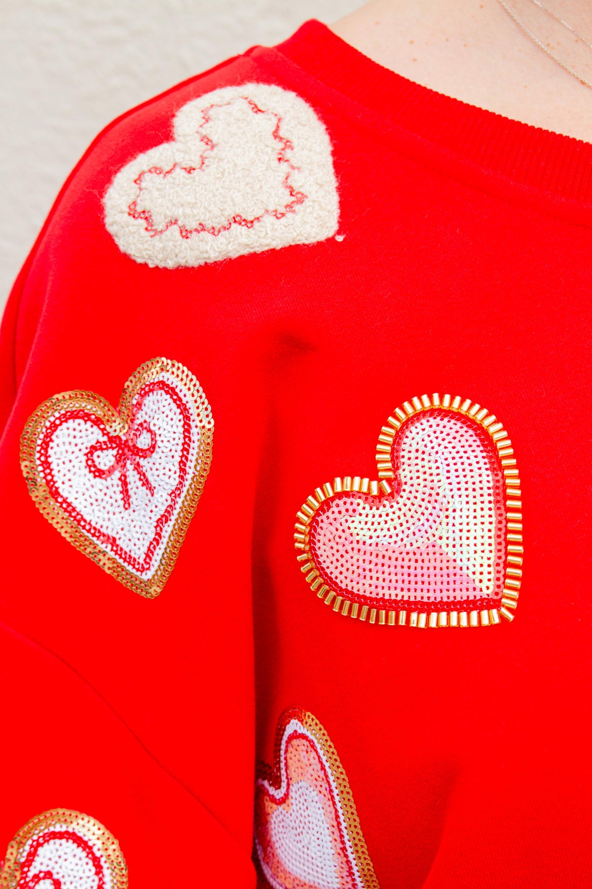 Red Heart Cookies Oversized Sweatshirt with Crew Neck and Sequin Accents. Fabric: 85.7% Cotton, 14.2% Polyester