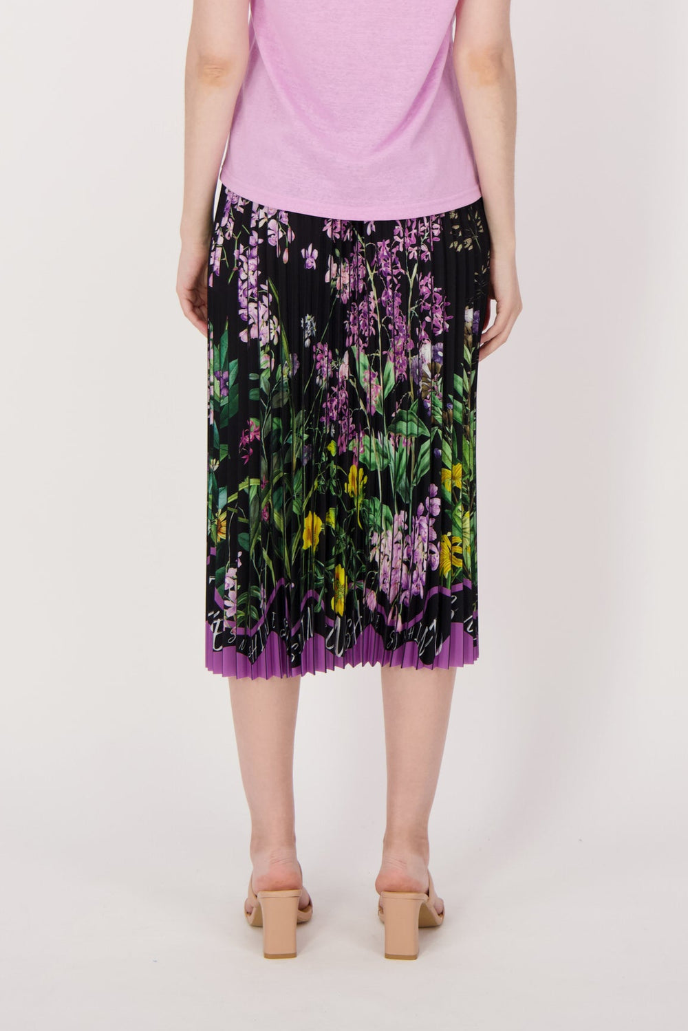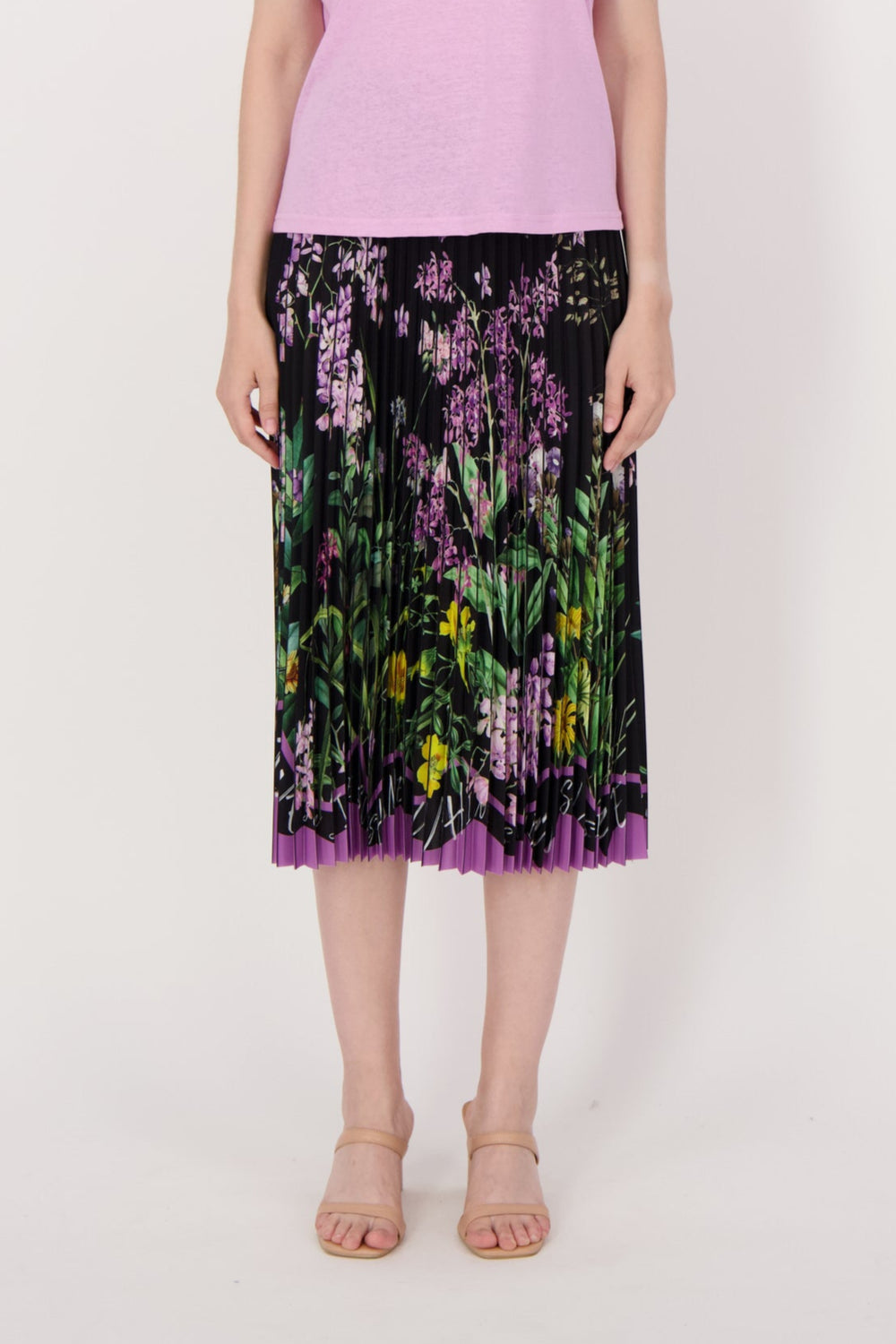 Black Pleated Pull On Floral Midi Skirt. Fabric: 100% Polyester