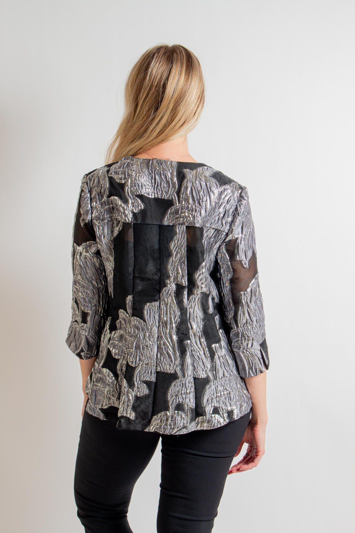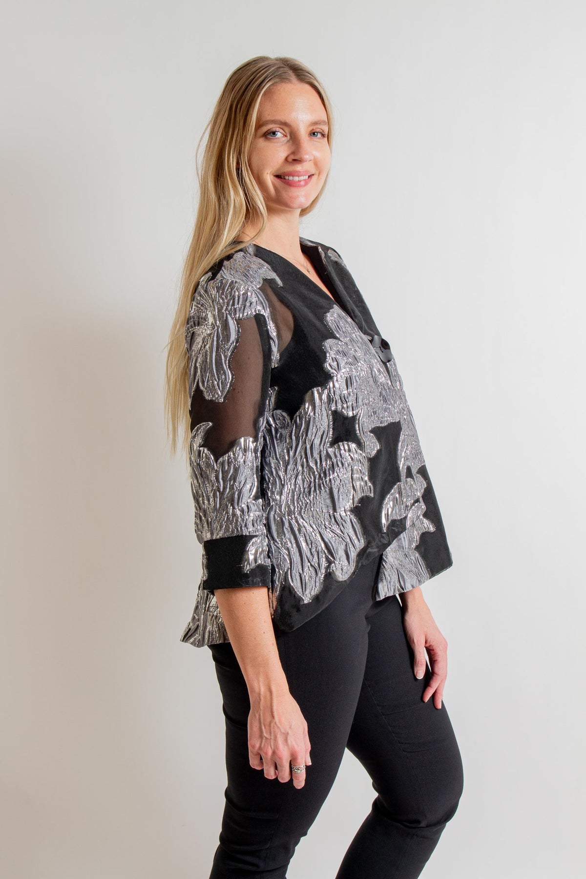Introducing the Frank Lyman blouse that perfectly blends elegance and versatility. Featuring a button closure and regular fit, this hip-length piece is adorned with jewels and buttons. The collared neckline and floral pattern make it ideal for formal, semi-formal, and night-out occasions. With 3/4 flare sleeves, this feminine, business-style blouse is perfect for everyday wear.
