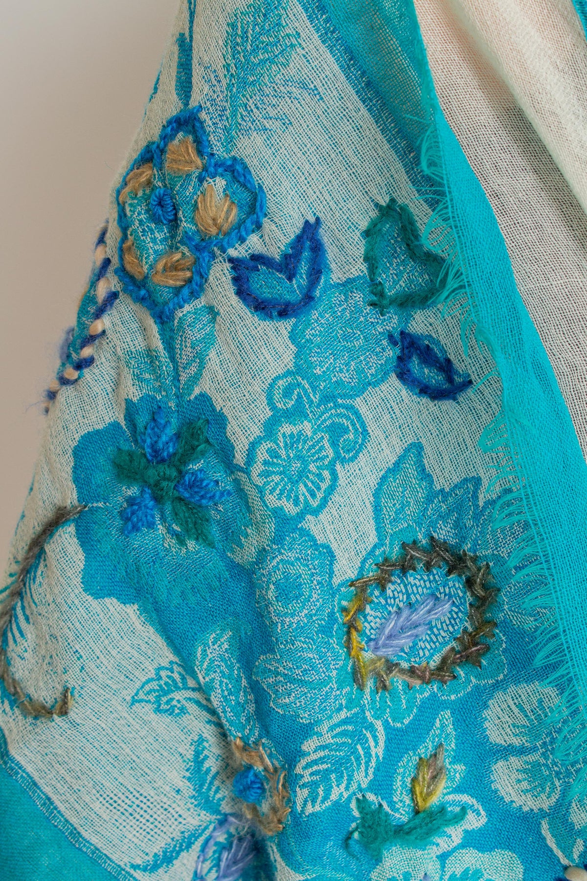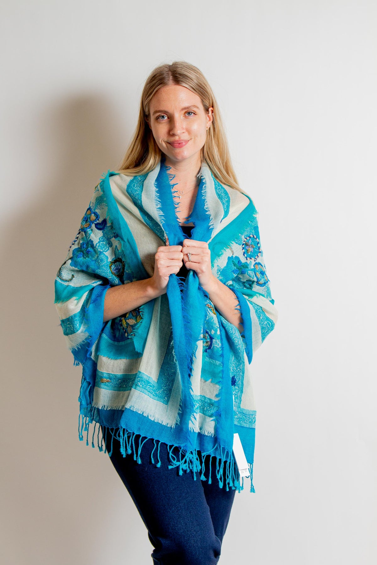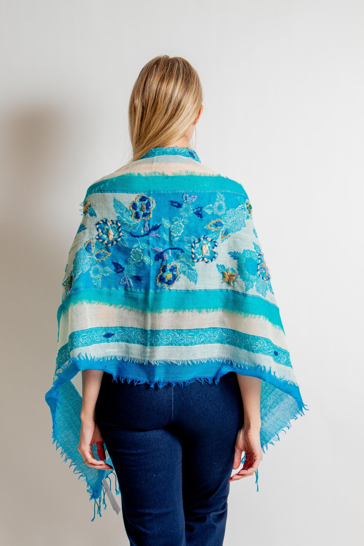 Colorful embroidered shawls are beautifully designed in subtle bright multi colors. This wrap is designed by skilled craftsmen in different jacquard colors complementing each other with hand embroidered multicolor designs. Lightweight and perfect for a summer evening.