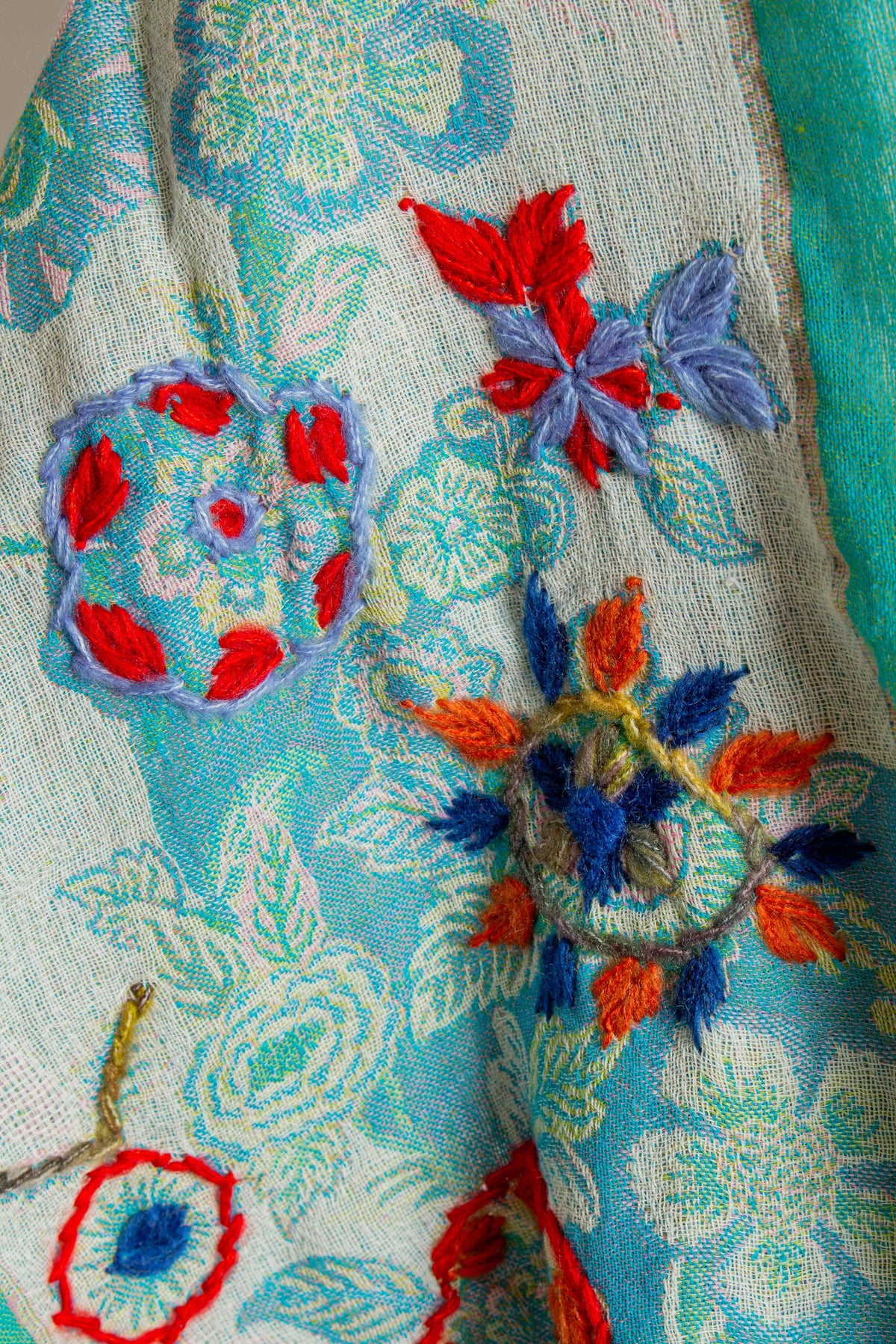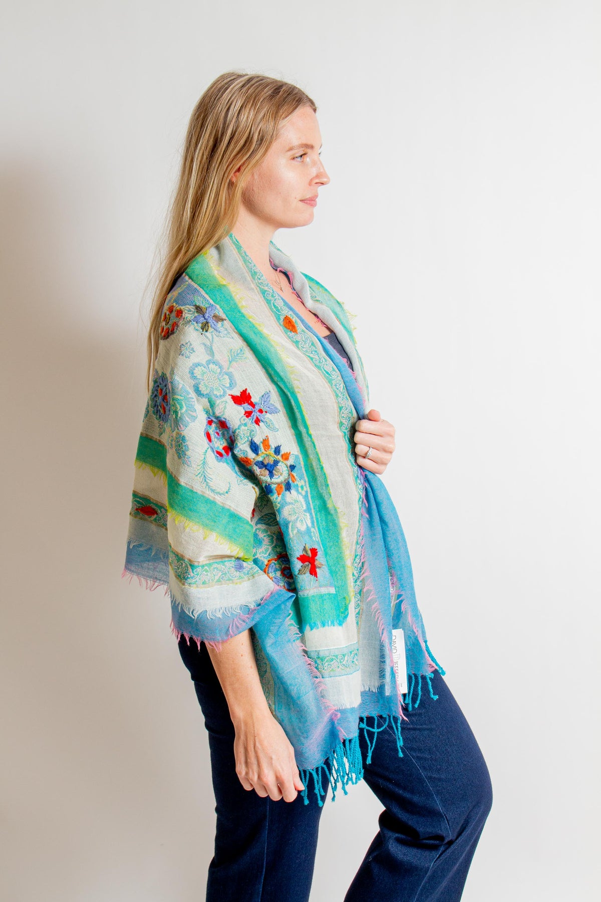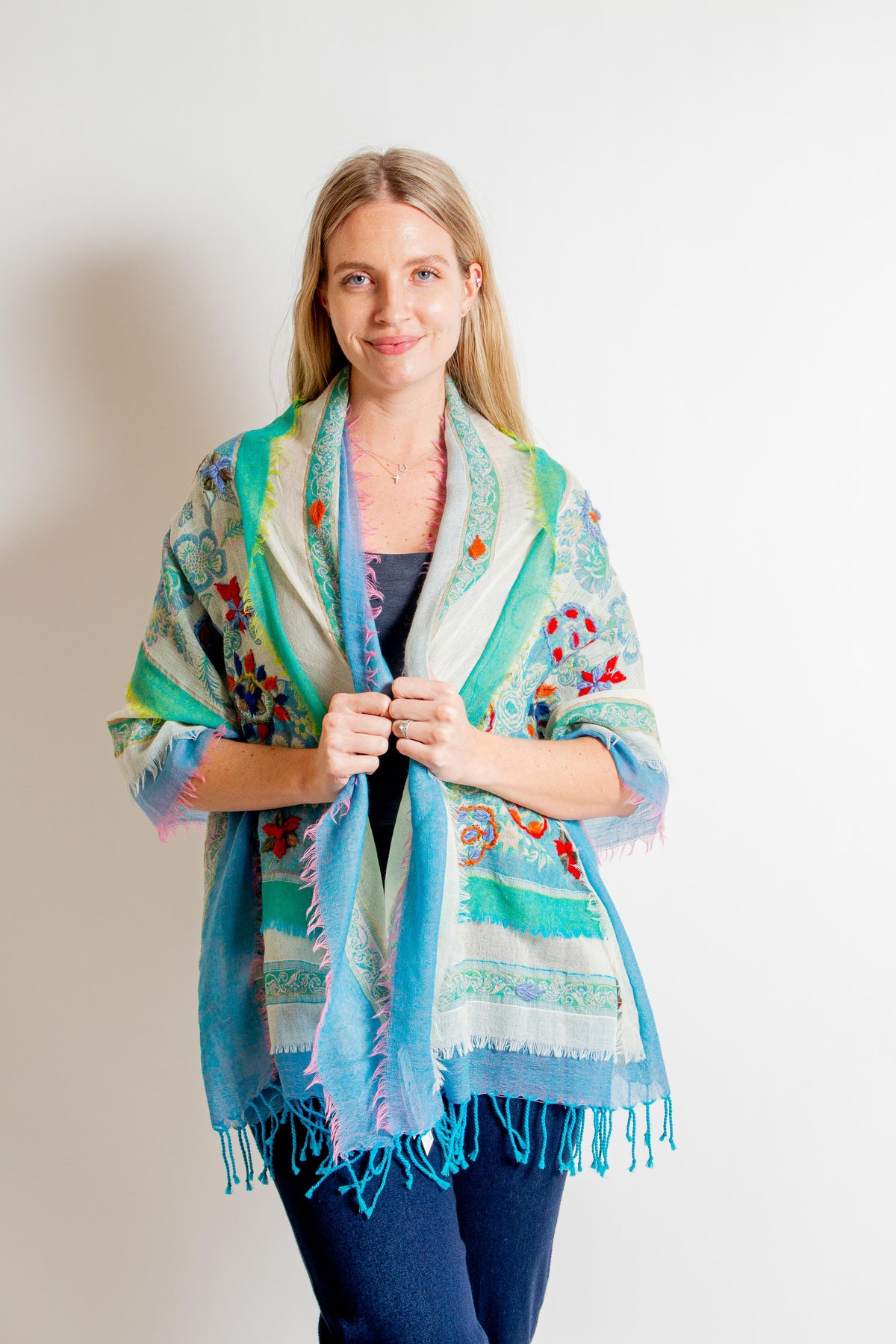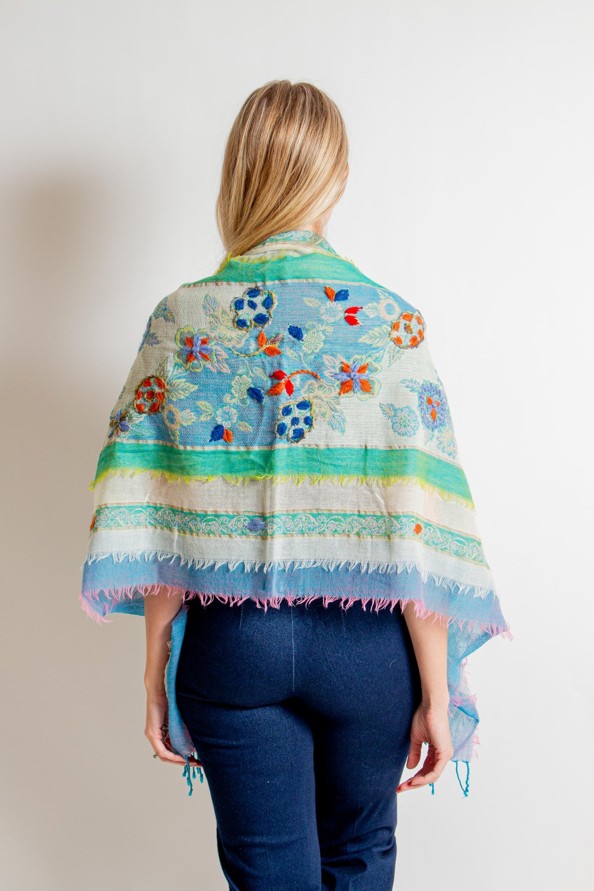 Blue Ivory Green w. Colorful Embroidery Shawl