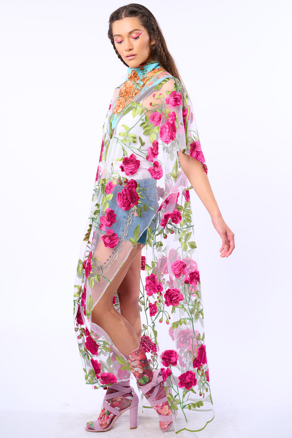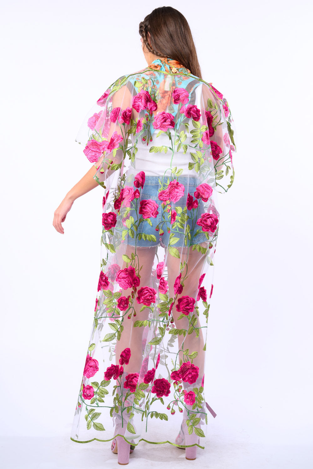 Rose embroidered mesh kimono with scallop hem/center front