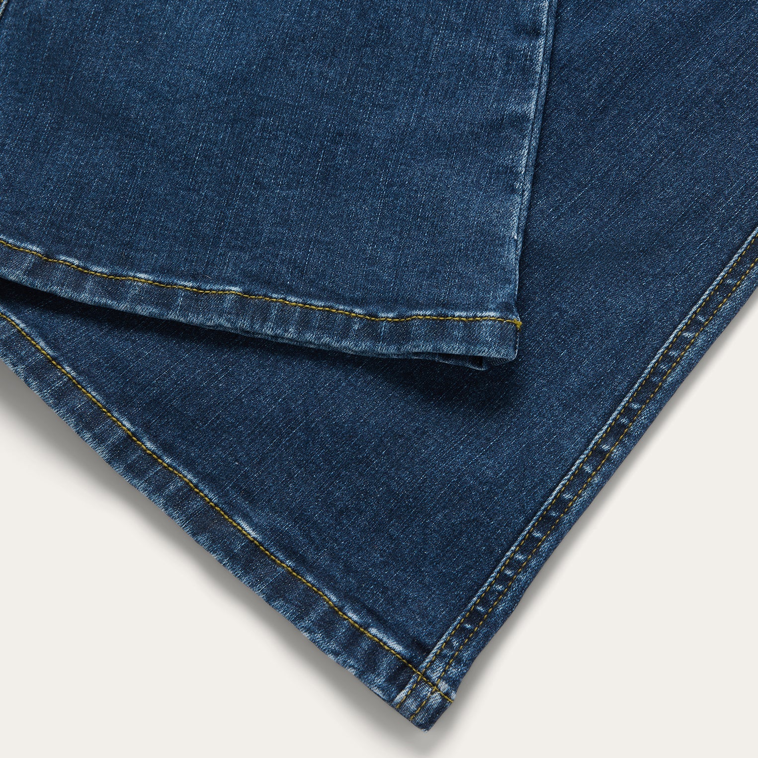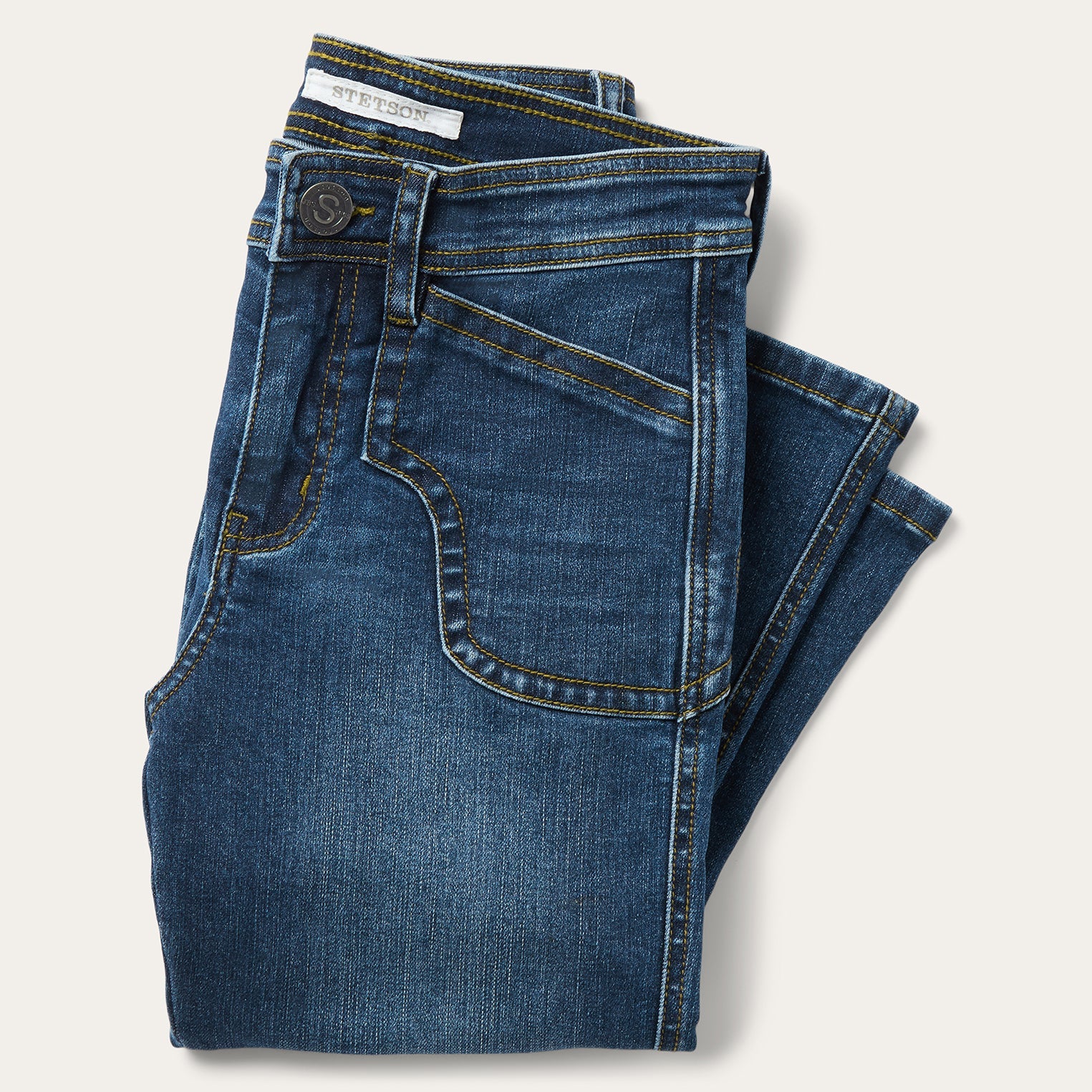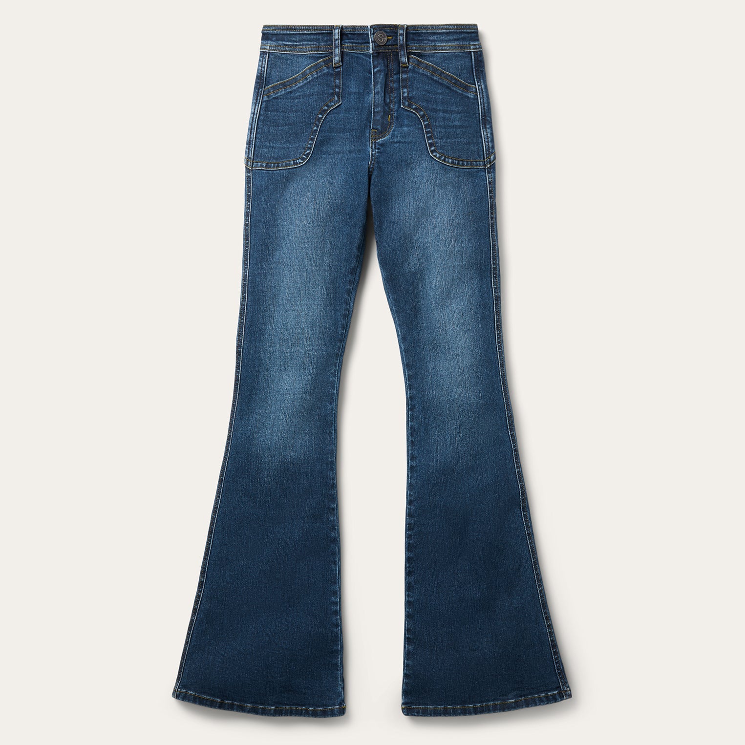 The 921 High Waist Flare Fit Jean is crafted from premium stretch denim for comfort, structure, and a flattering silhouette. With a slim fit through the thigh and knee and a flare leg opening, it delivers a classic western look with bold, feminine shape. Stylized western line details on the curved hip yoke and front patch pockets add subtle character, while the plain back pockets keep the profile clean. Finished with Stetson-branded hardware and light sanding for a broken-in feel.
