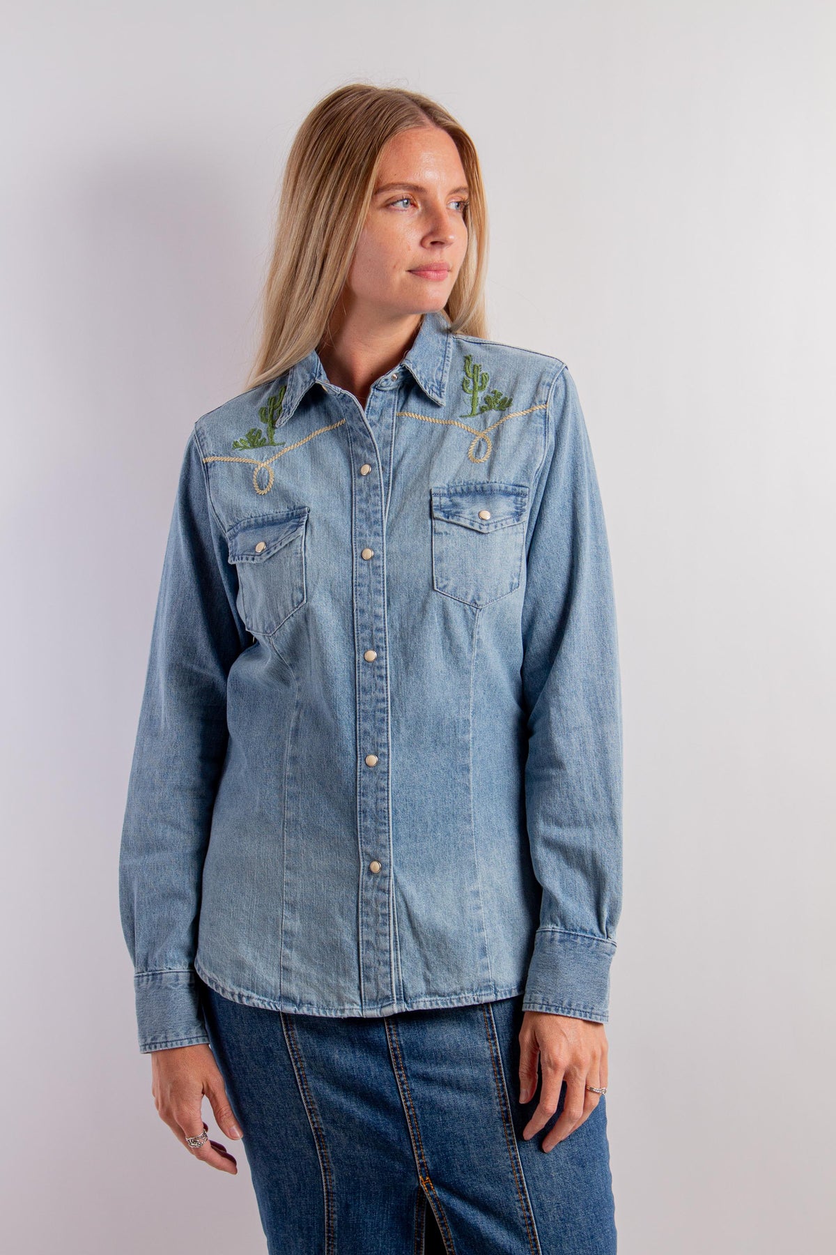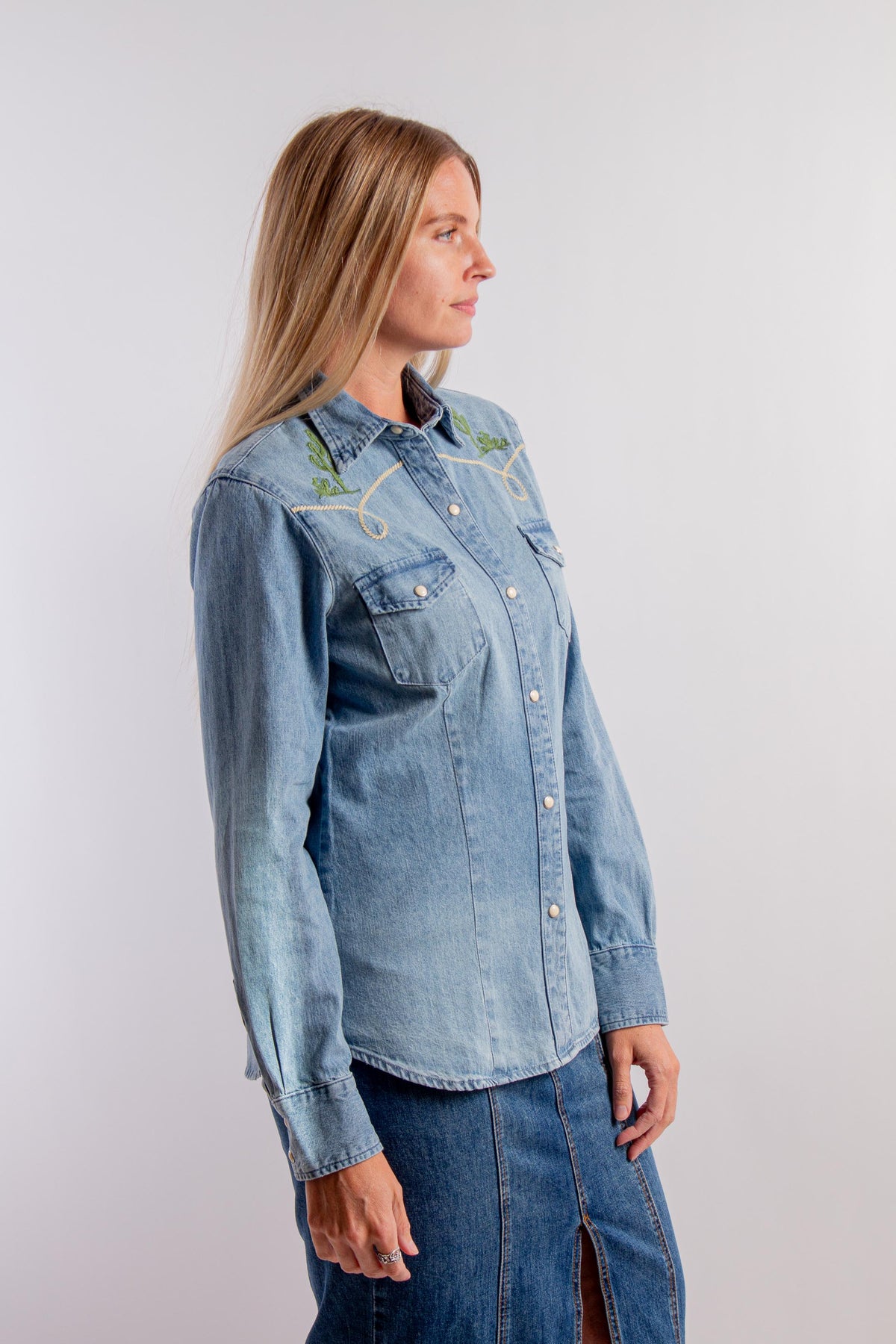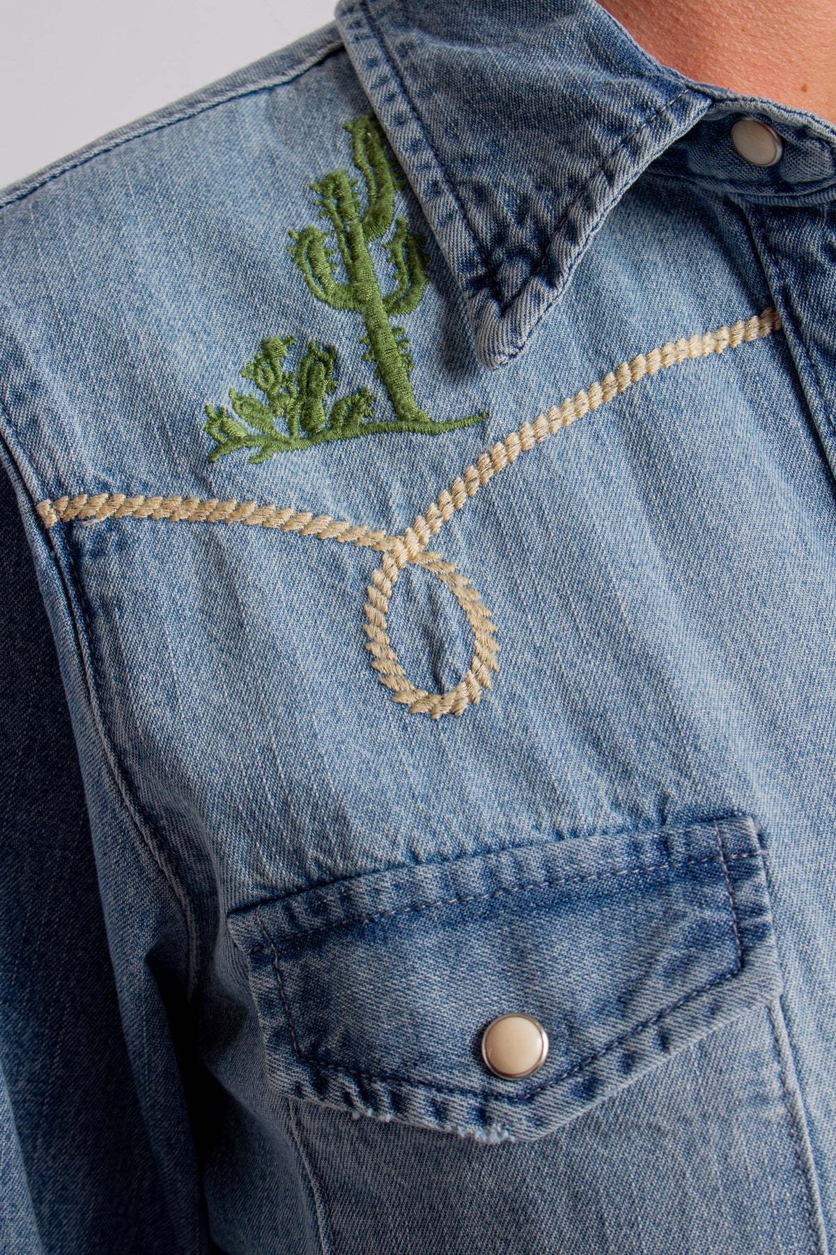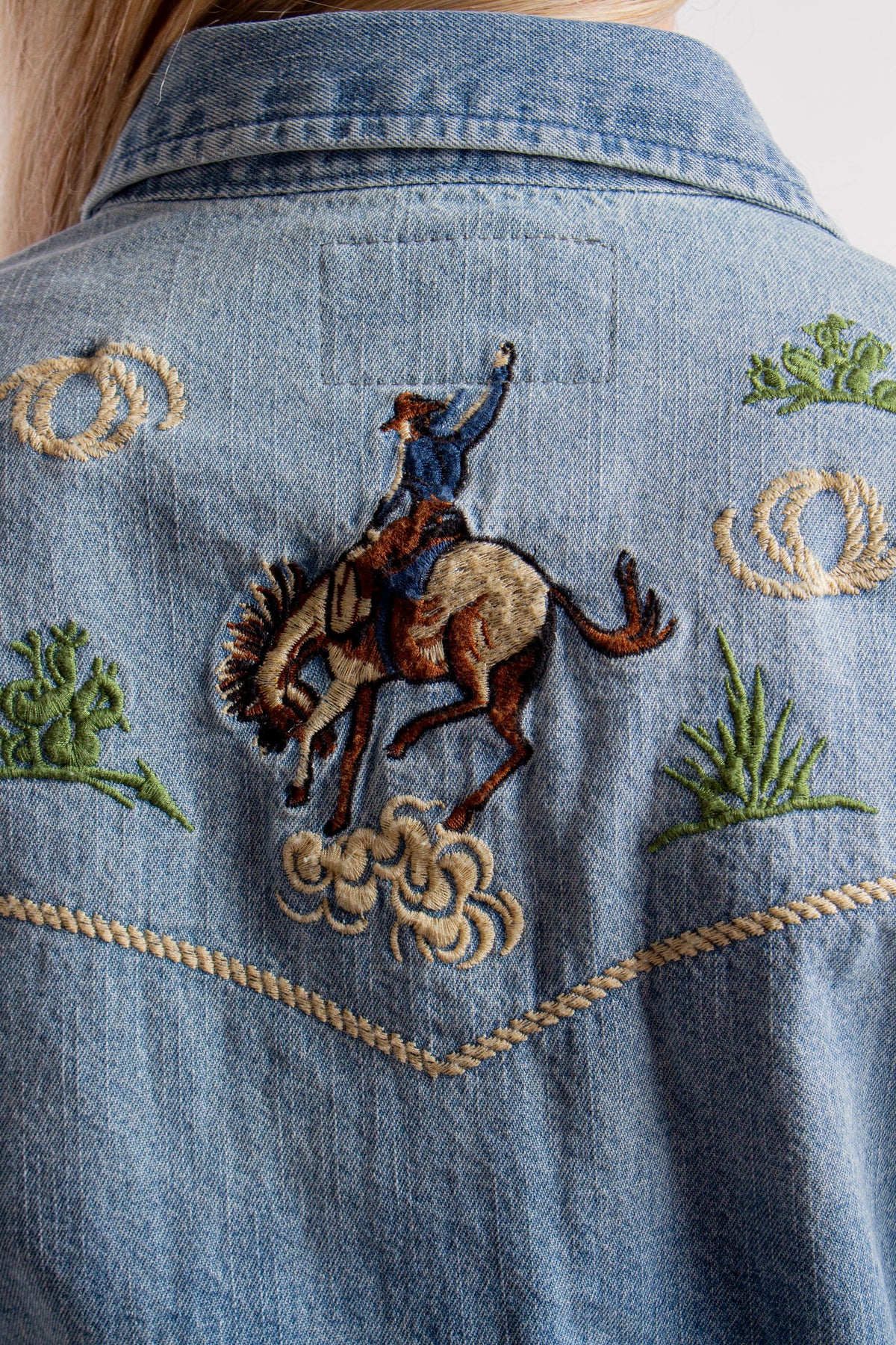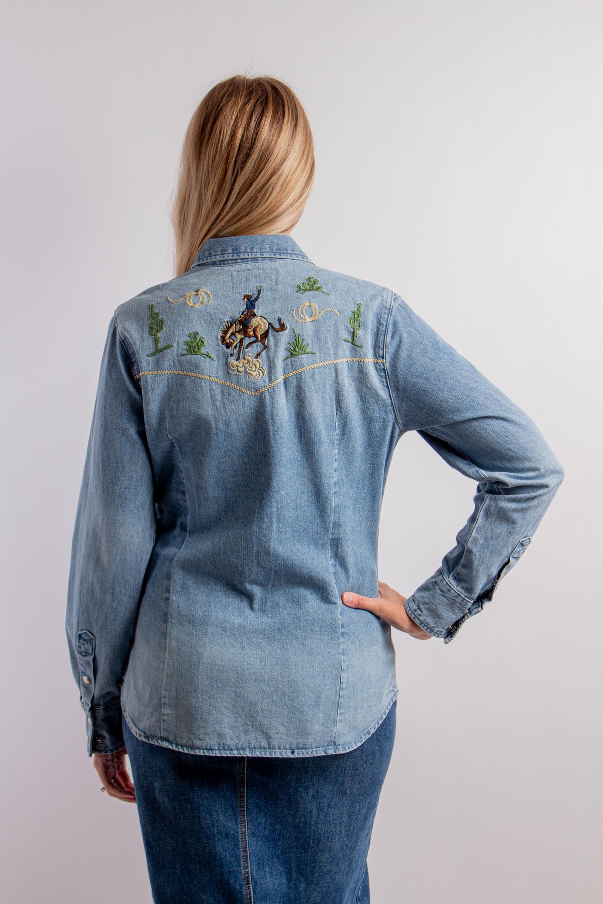 Front Snap Embroidered Old West Shirt with Long Sleeves, Collar and Bronc Rider Embroidery at Back. Fabric: 100% Cotton