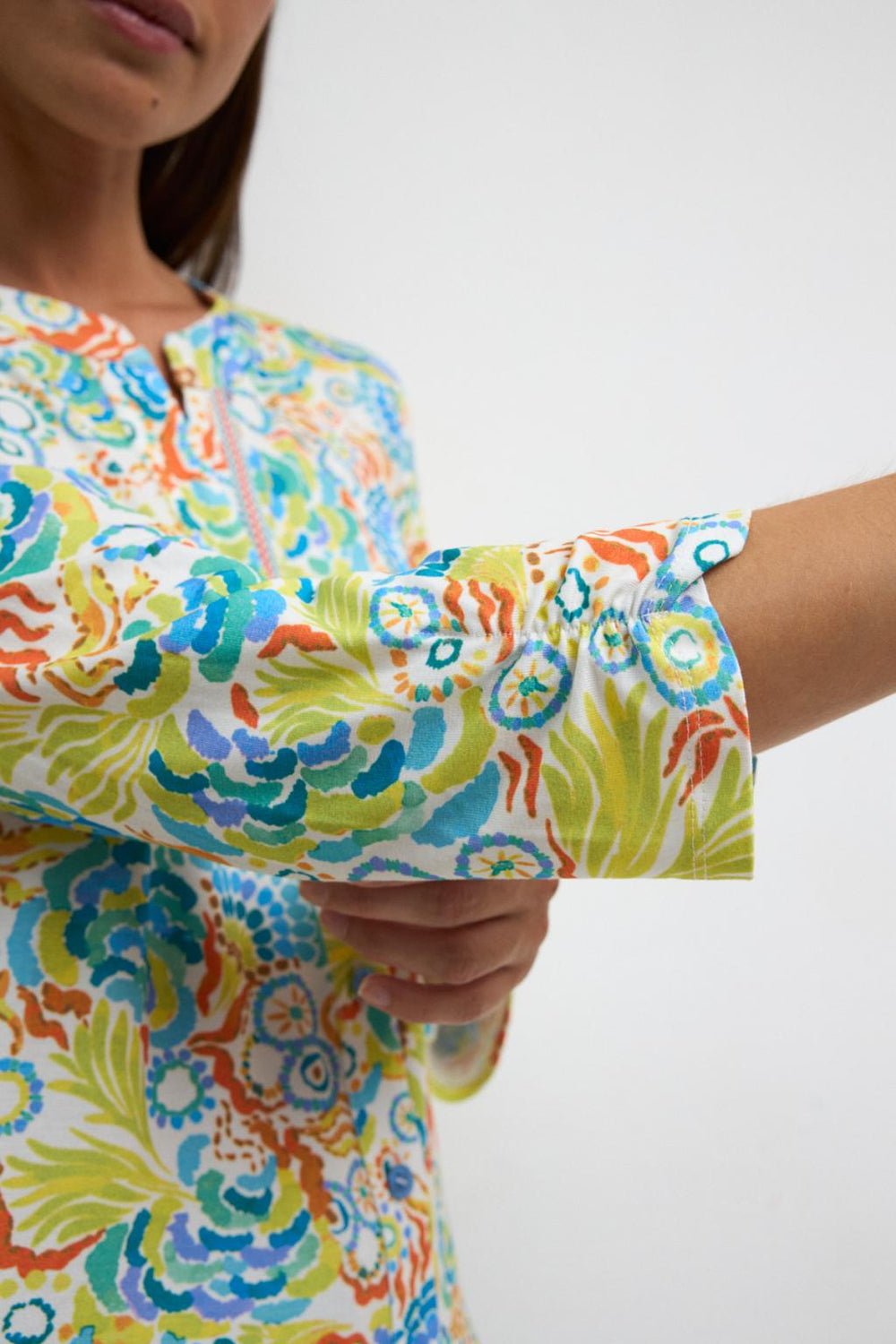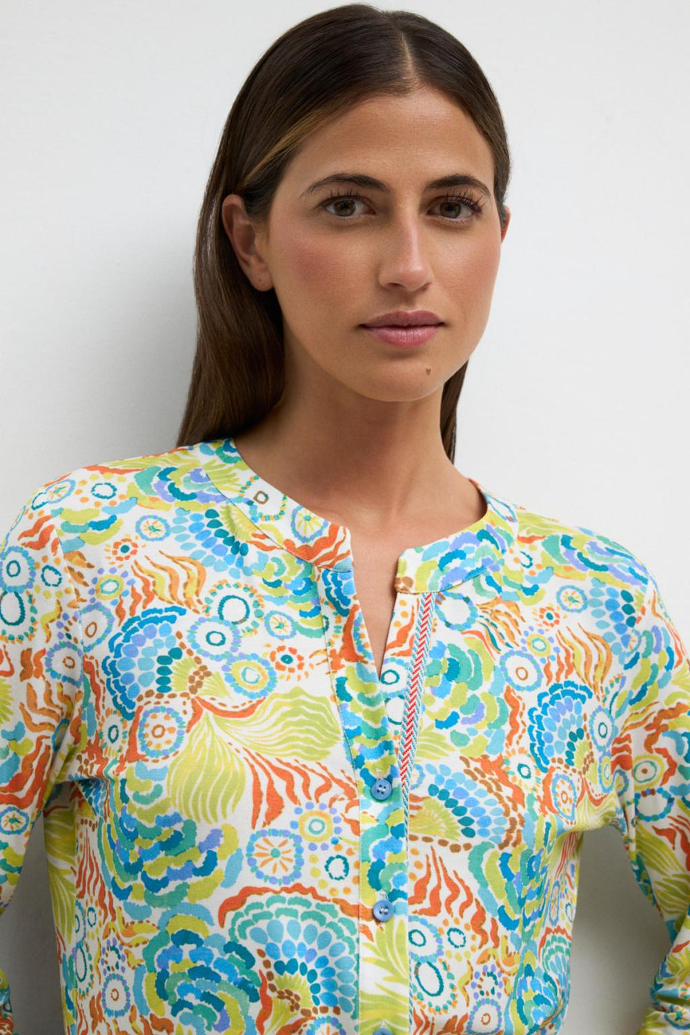 "Bruna" Lima Abstract Print Top with Front Button Closure, V-Neck and 3/4 Draw Sleeves. Fabric: 96% Rayon, 4% Spandex