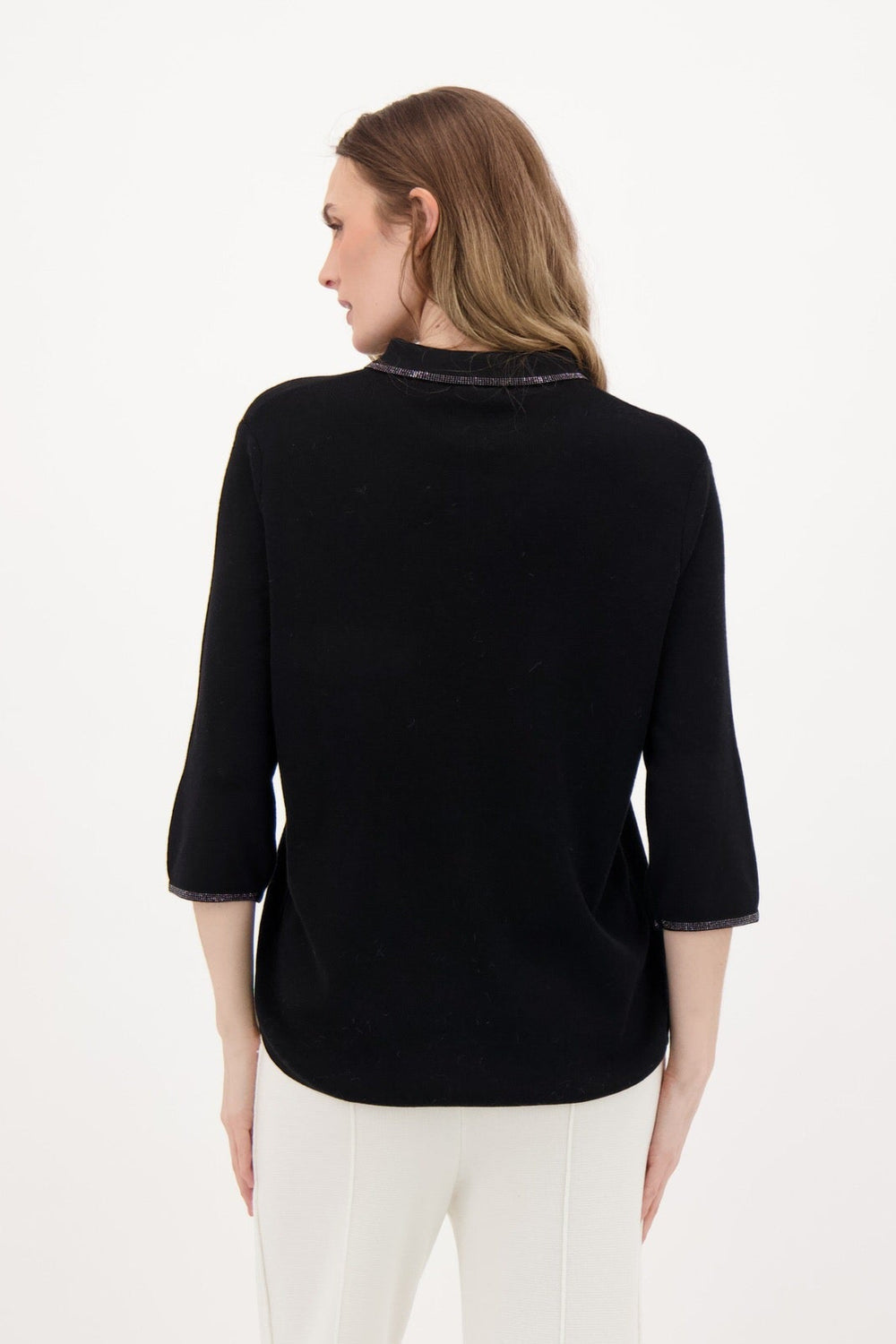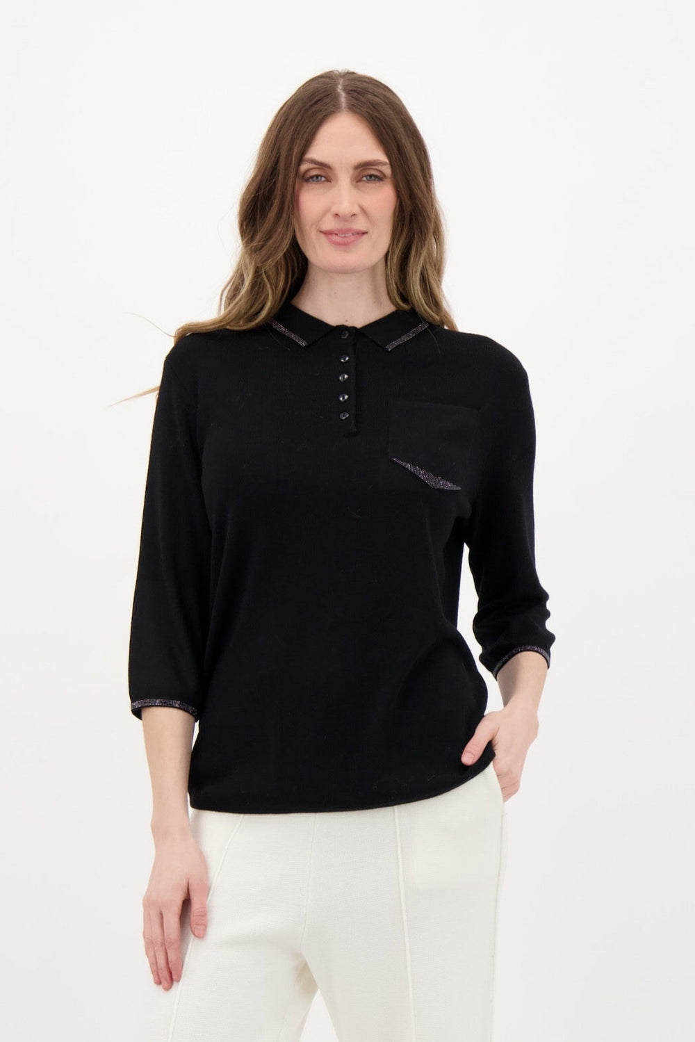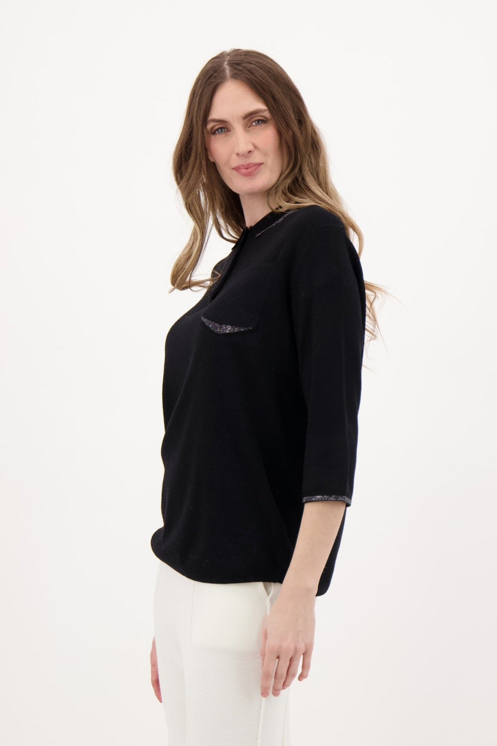 Black 3/4 Sleeve Sweater with Front Chest Pocket and Rhinestone Accents at Collar. Fabric: 56% Polyester, 20% Acrylic, 20% Nylon, 4% Other Fibers