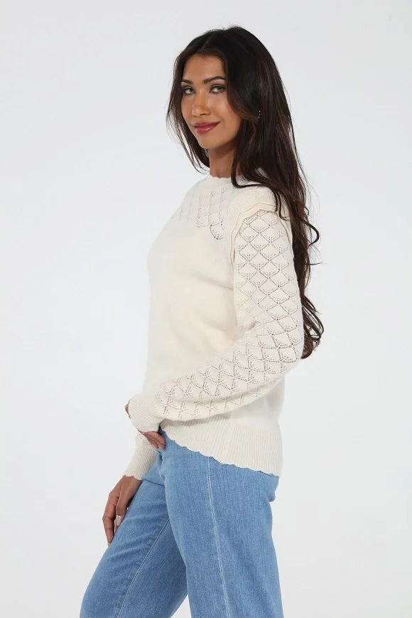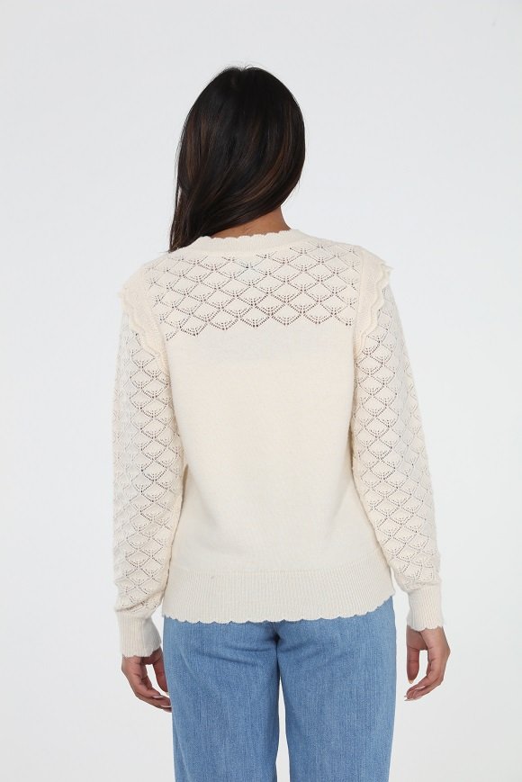 The Dahlia Sweater: A cozy and warm piece, this sweater features a cute ruffle detail on the upper chest and a charming knit pattern