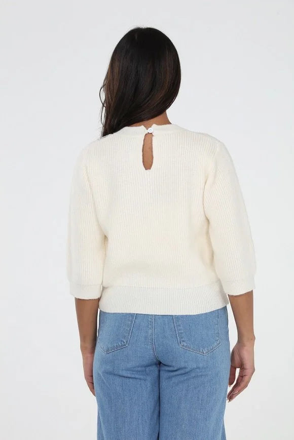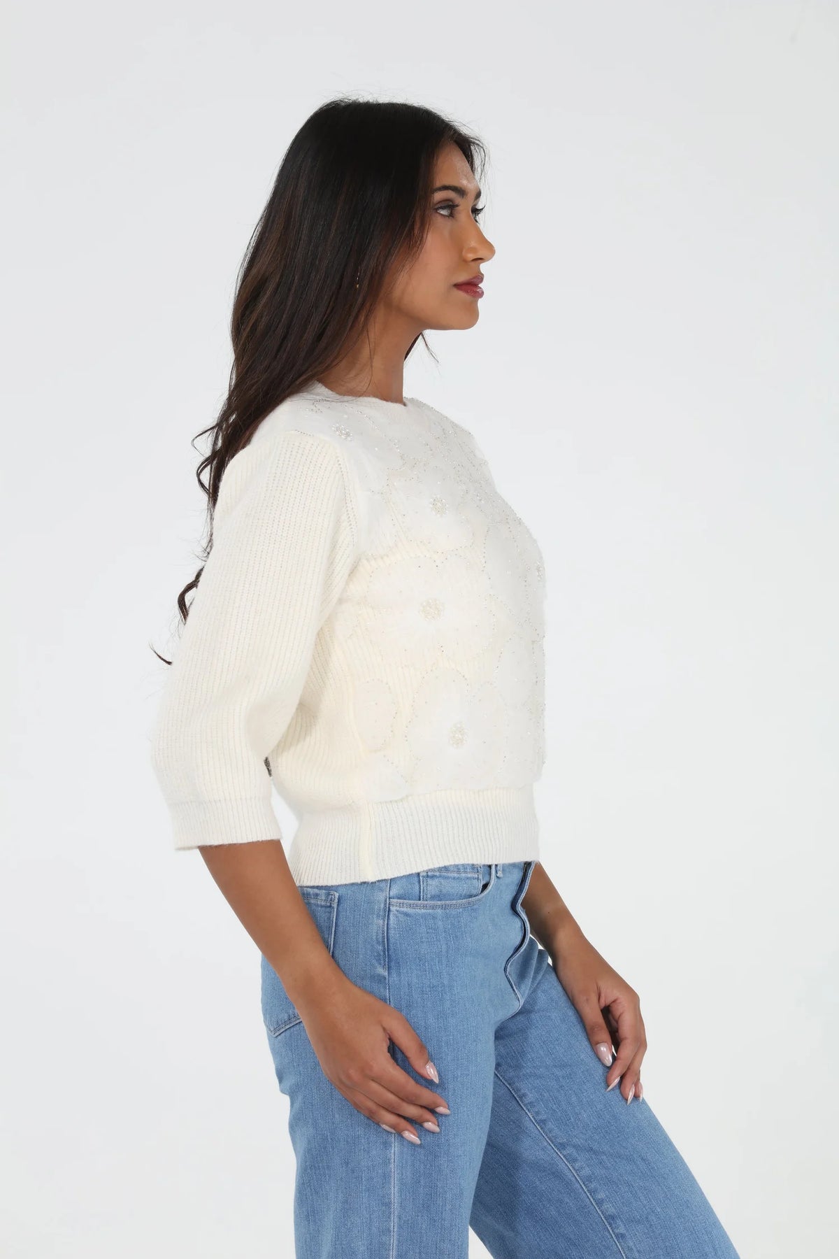 The Olive Sweater Blouse in Ivory: This cozy blouse features a delicate lace front design with floral accents, blending charm and elegance.