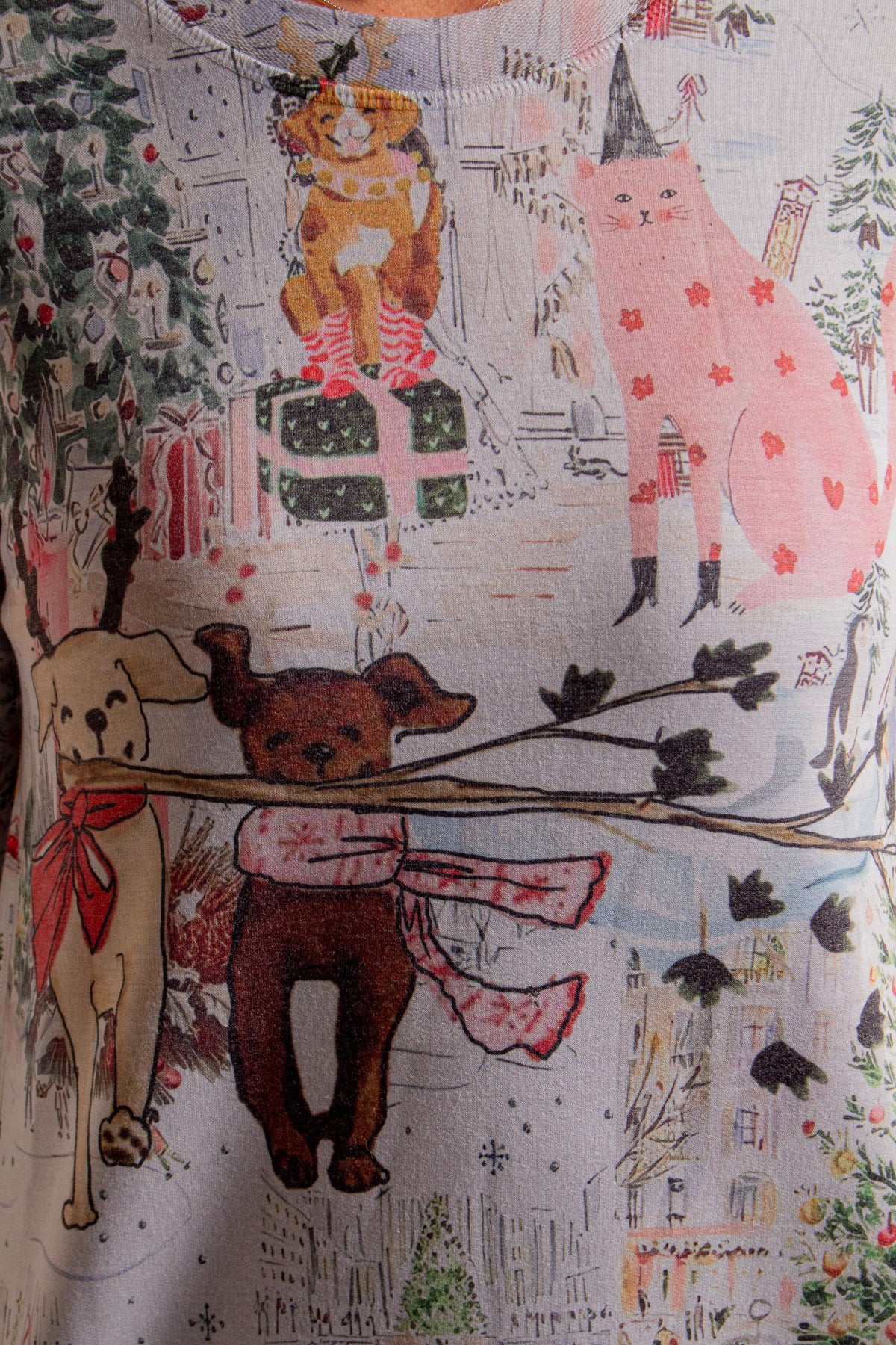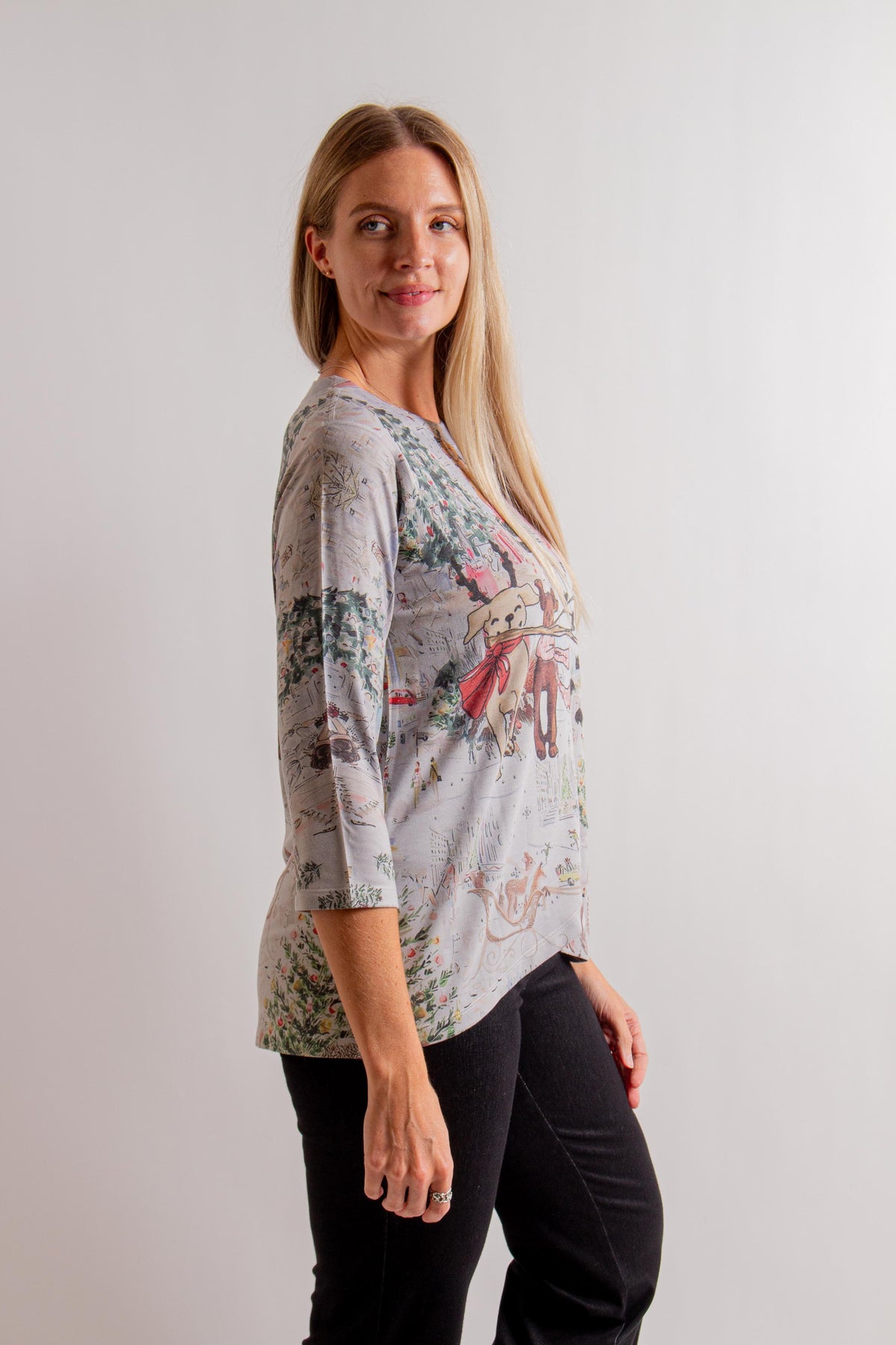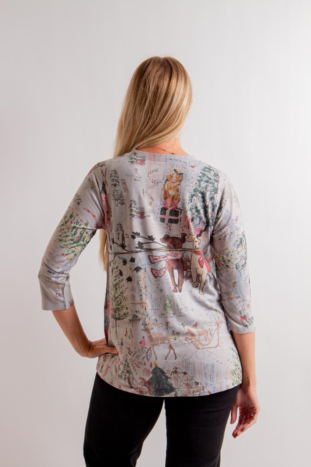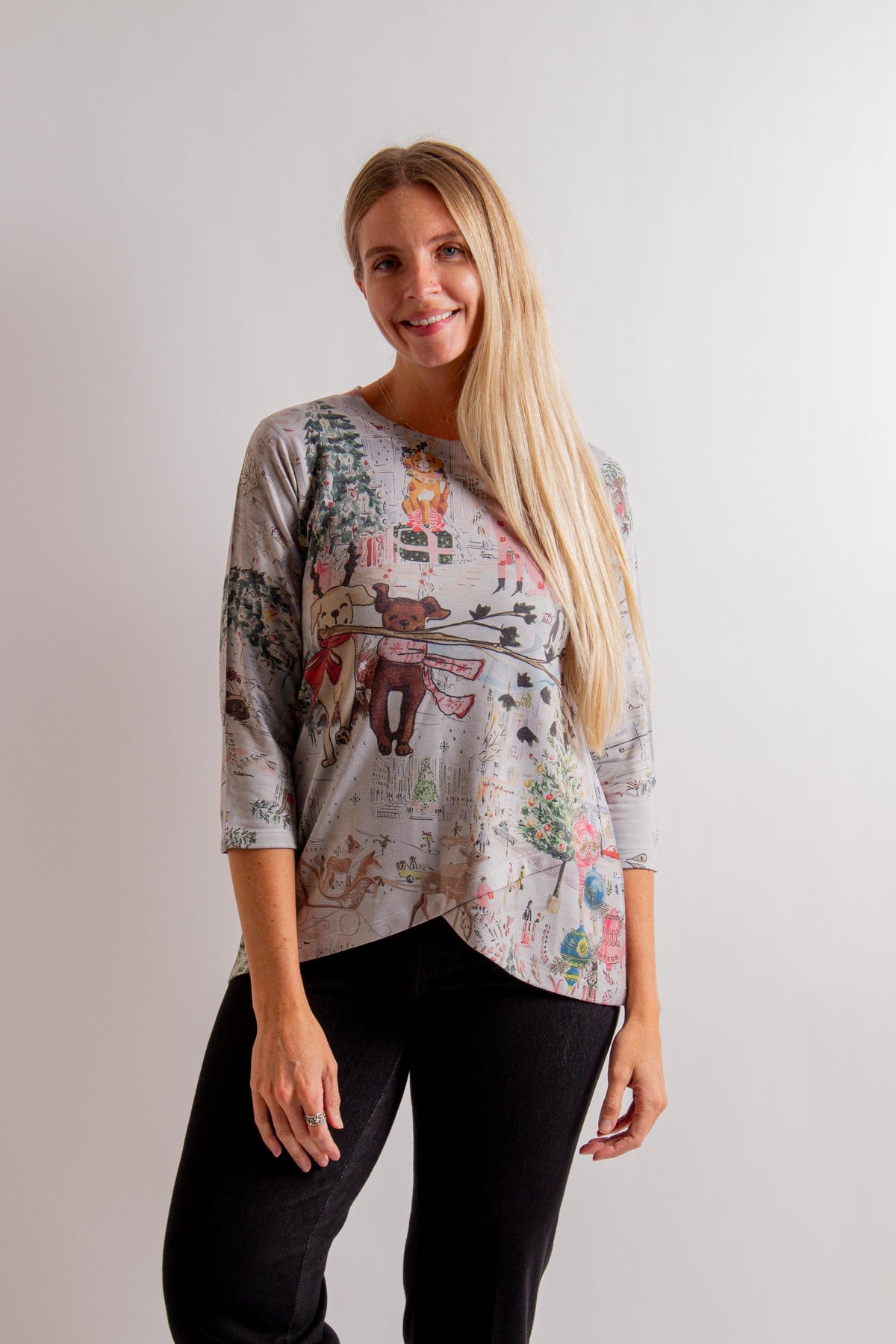"Holiday Joy" Crew Neck Top with Tulip Hem and 3/4 Sleeves. Fabric: 86% Polyester, 10% Rayon, 4% Spandex