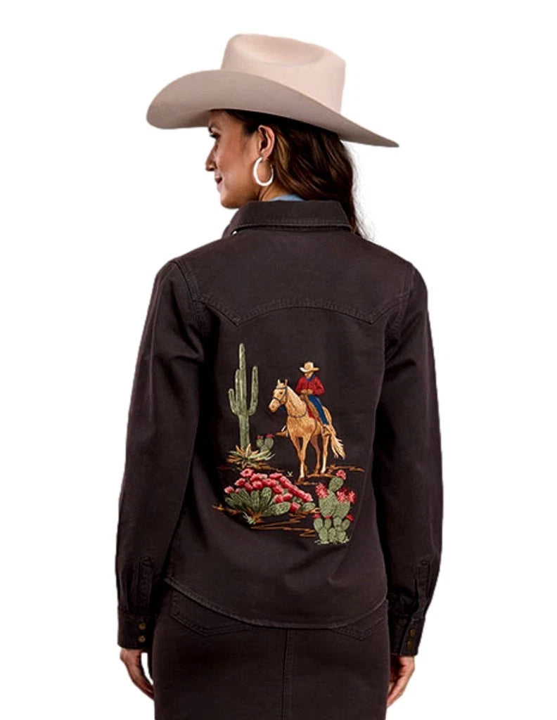 Brown Denim Front Button Top w/ Western Cowboy Riding Horse Embroidery at Back
