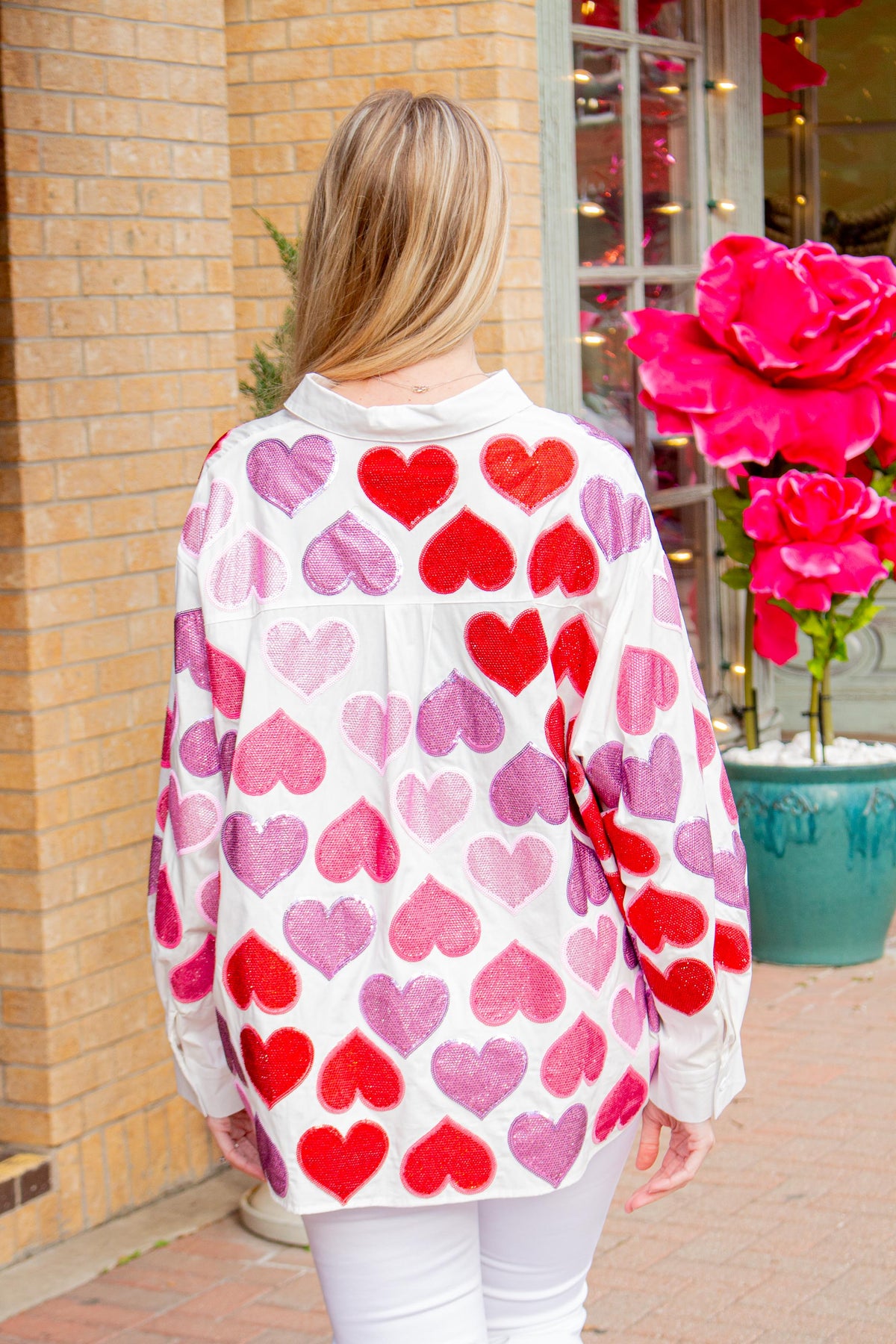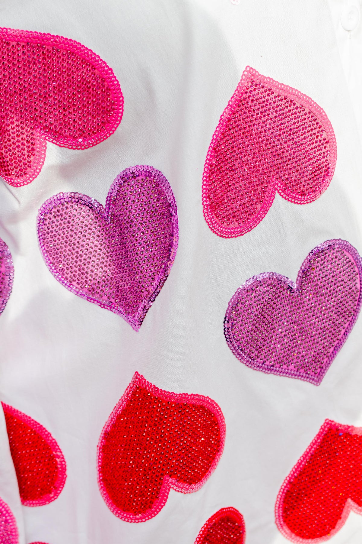 White Multi Rhinestone Hearts Front Button Up Top with Collar and Long Sleeves.