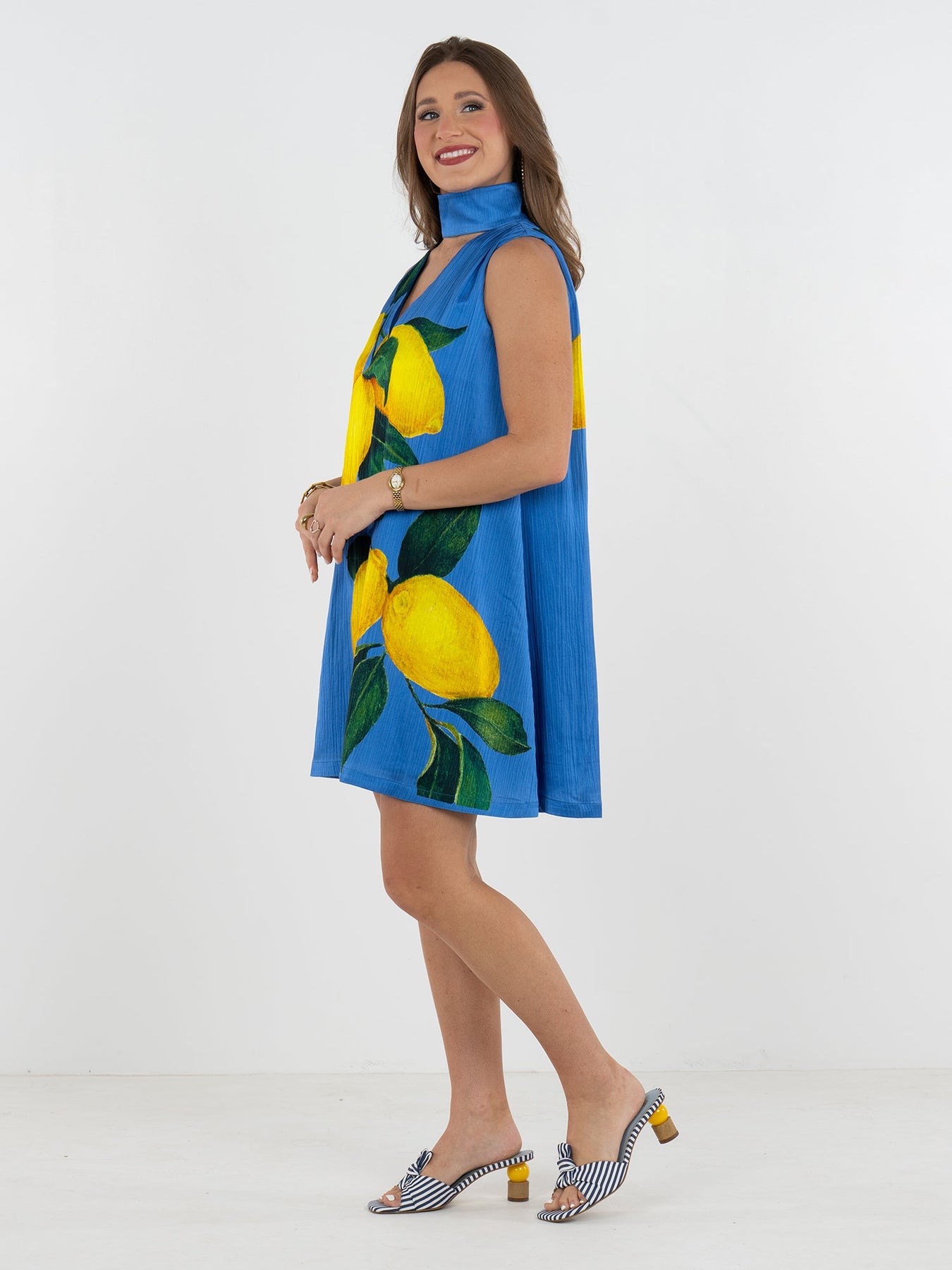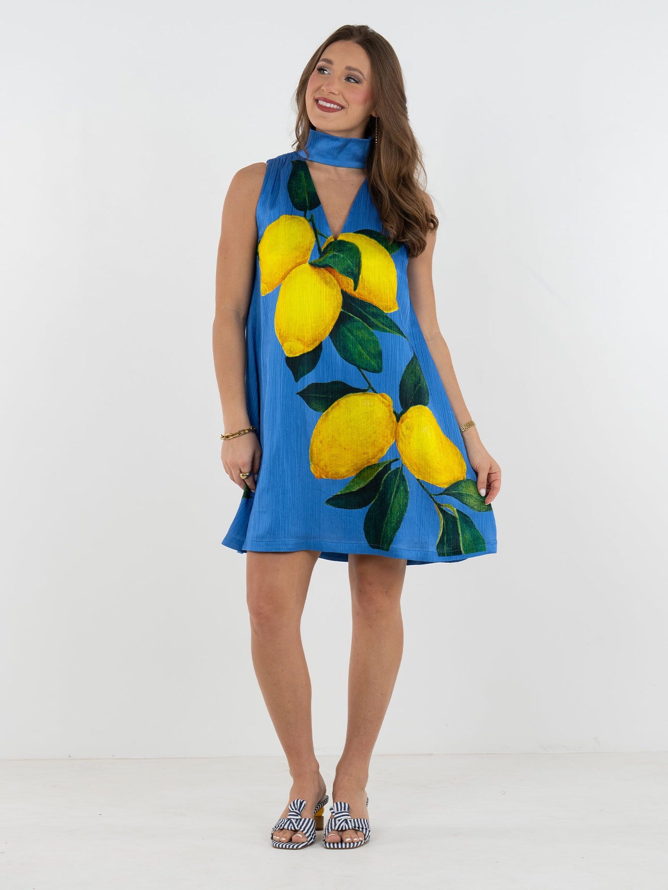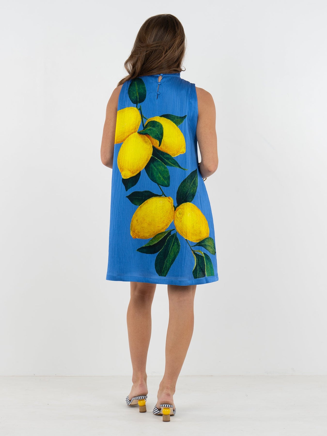 A warm-weather take on the signature Sasha Mini, the Milan Mini features a keyhole neckline, relaxed silhouette, and back button closure. The hand-painted lemon motif is translated into a placed print set against a vibrant blue backdrop, while the silk blend fabrication adds soft sheen and texture. Designed for summer events and statement dressing.