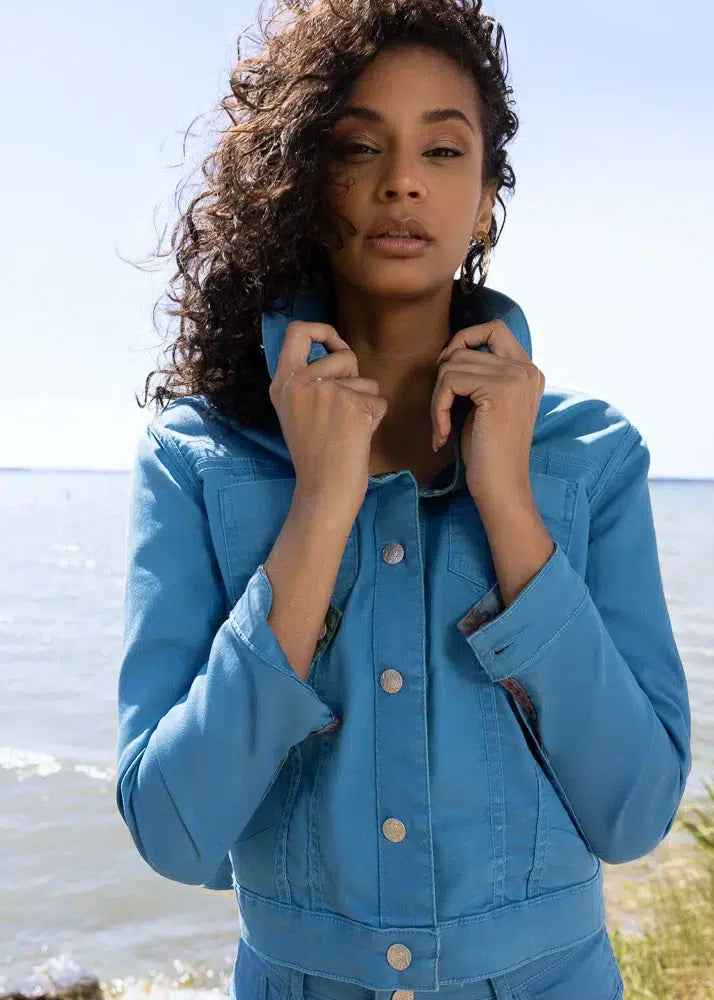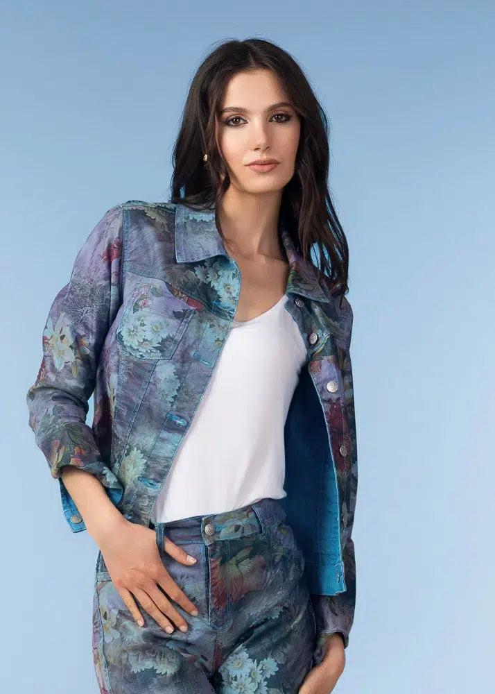 Multicolor Floral Print Reversible Jacket with Front Button Closure, Pockets and Collar. Reverses to Solid Turquoise. Fabric: 65% Cotton, 32% Polyester, 3% Spandex