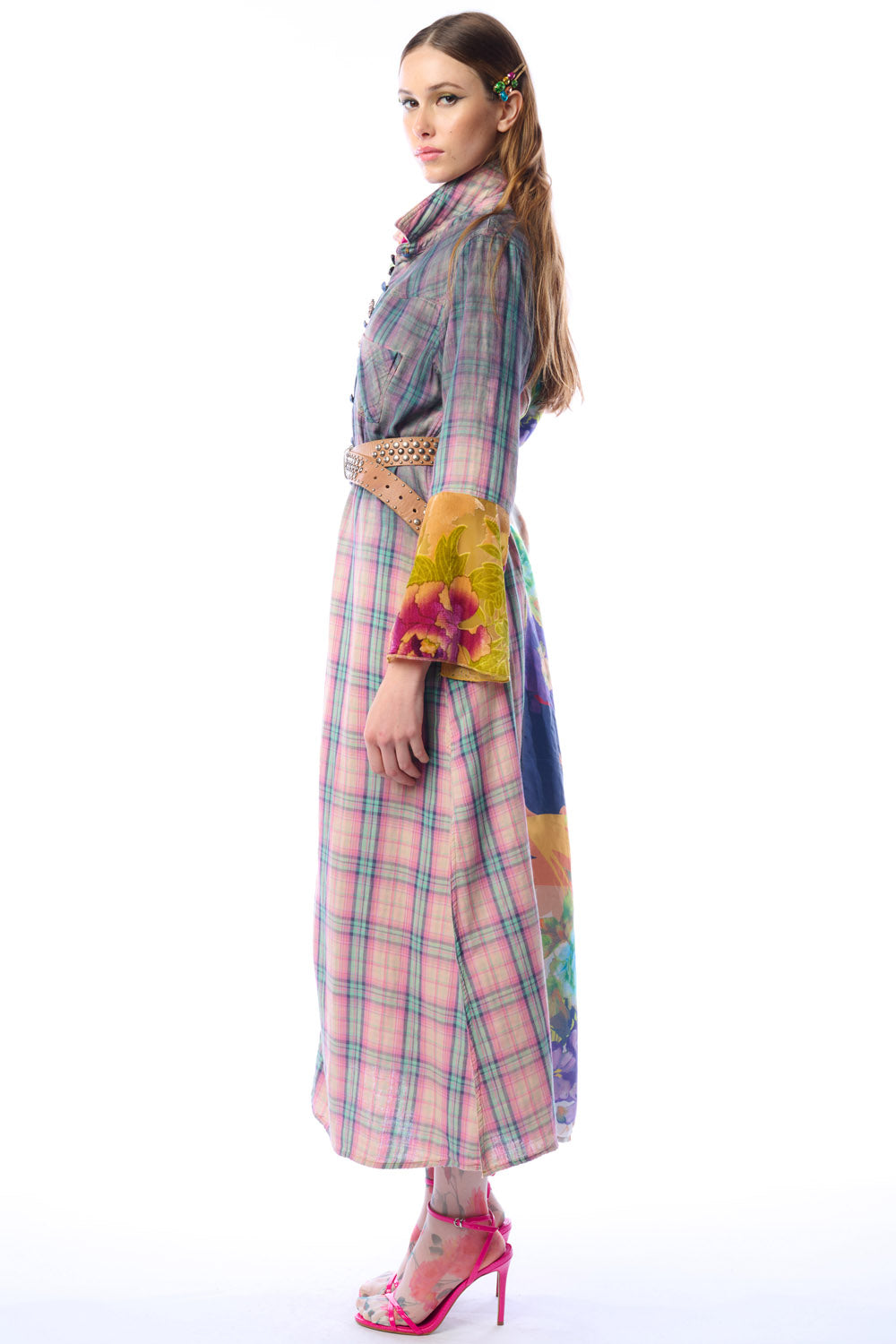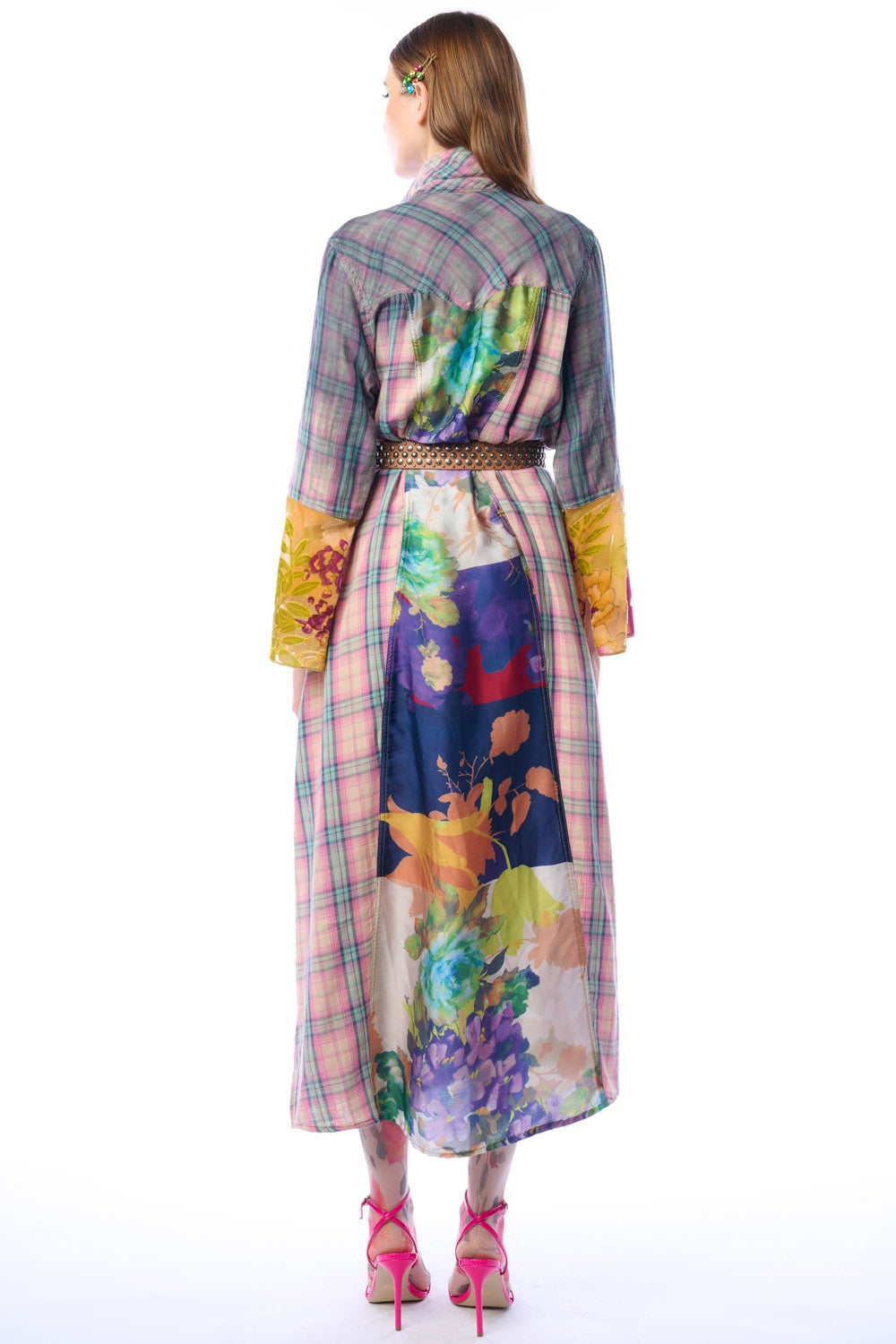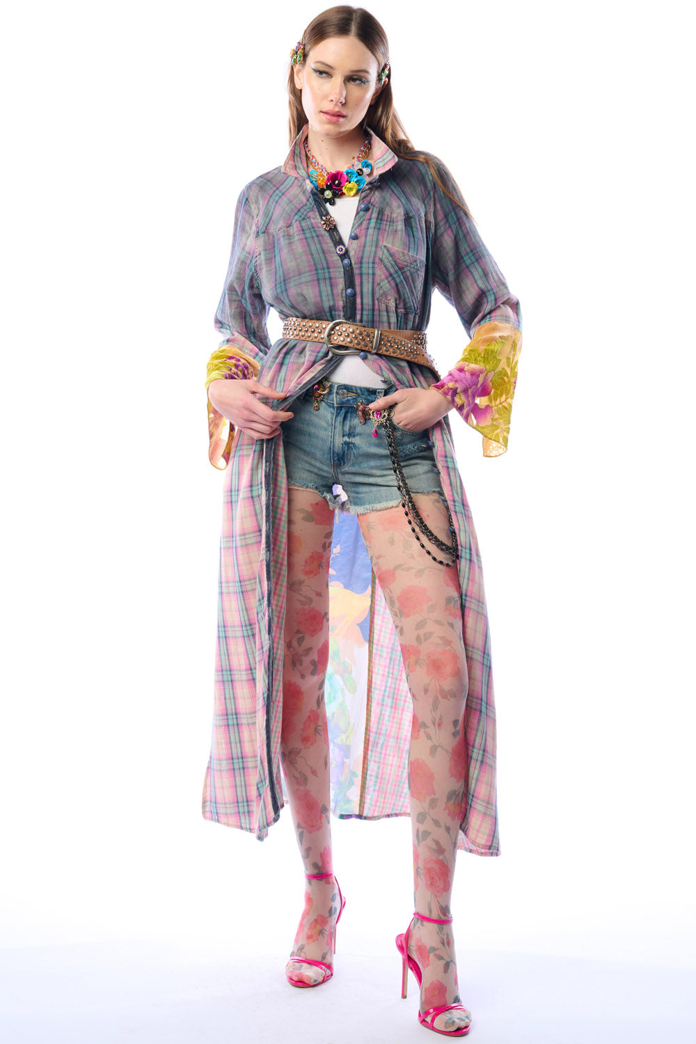 Washed ombre plaid button-up duster, lower sleeves with burnout velvet contrast fabric, floral print on center back, 2 decorative crystal buttons sewn on velvet center front placket, 2 side pockets