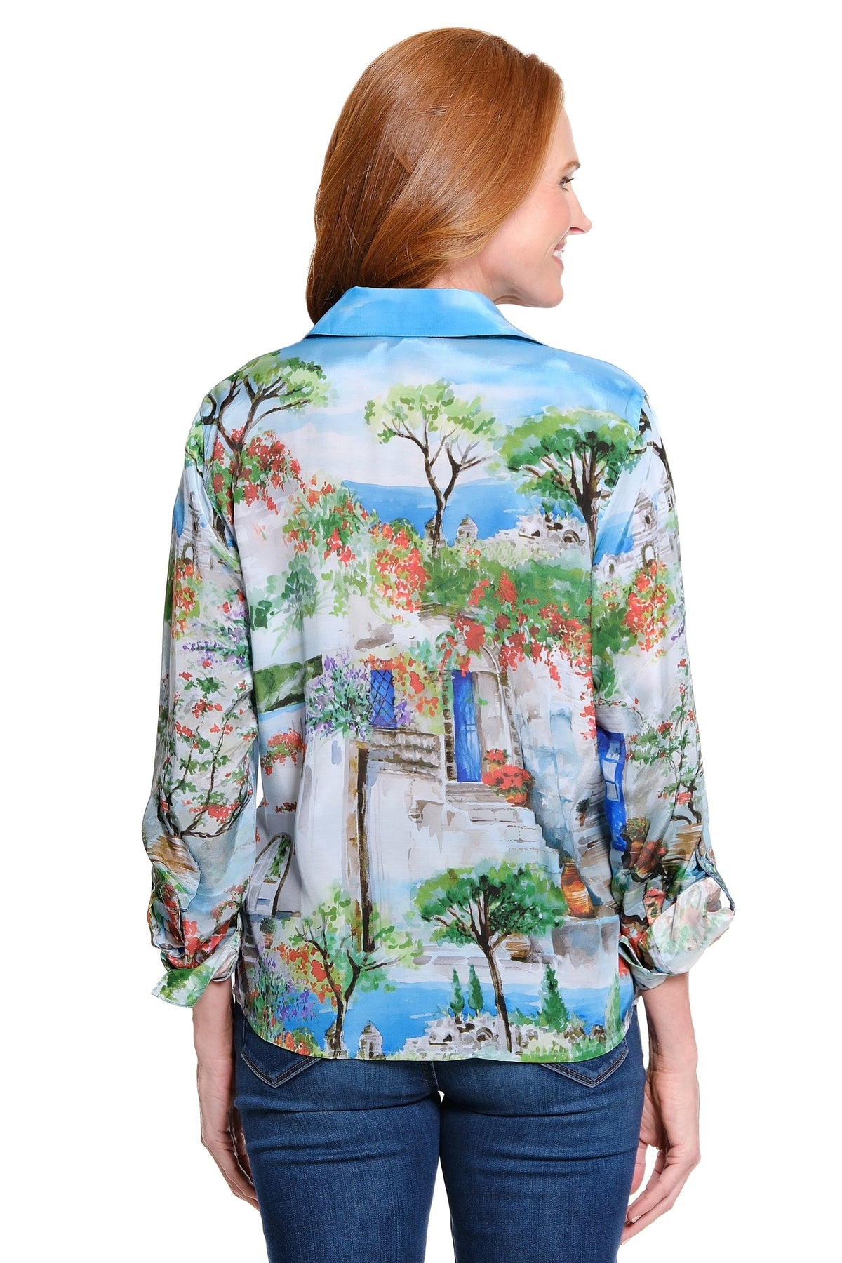 This blouse features a scenic landscape print that adds a unique and artistic touch to your wardrobe. Made from soft viscose/rayon, it offers a lightweight and fluid feel, while the tie front detail creates a flattering shape. Roll tab sleeves provide versatility, allowing you to adjust the look for different occasions and comfort levels.