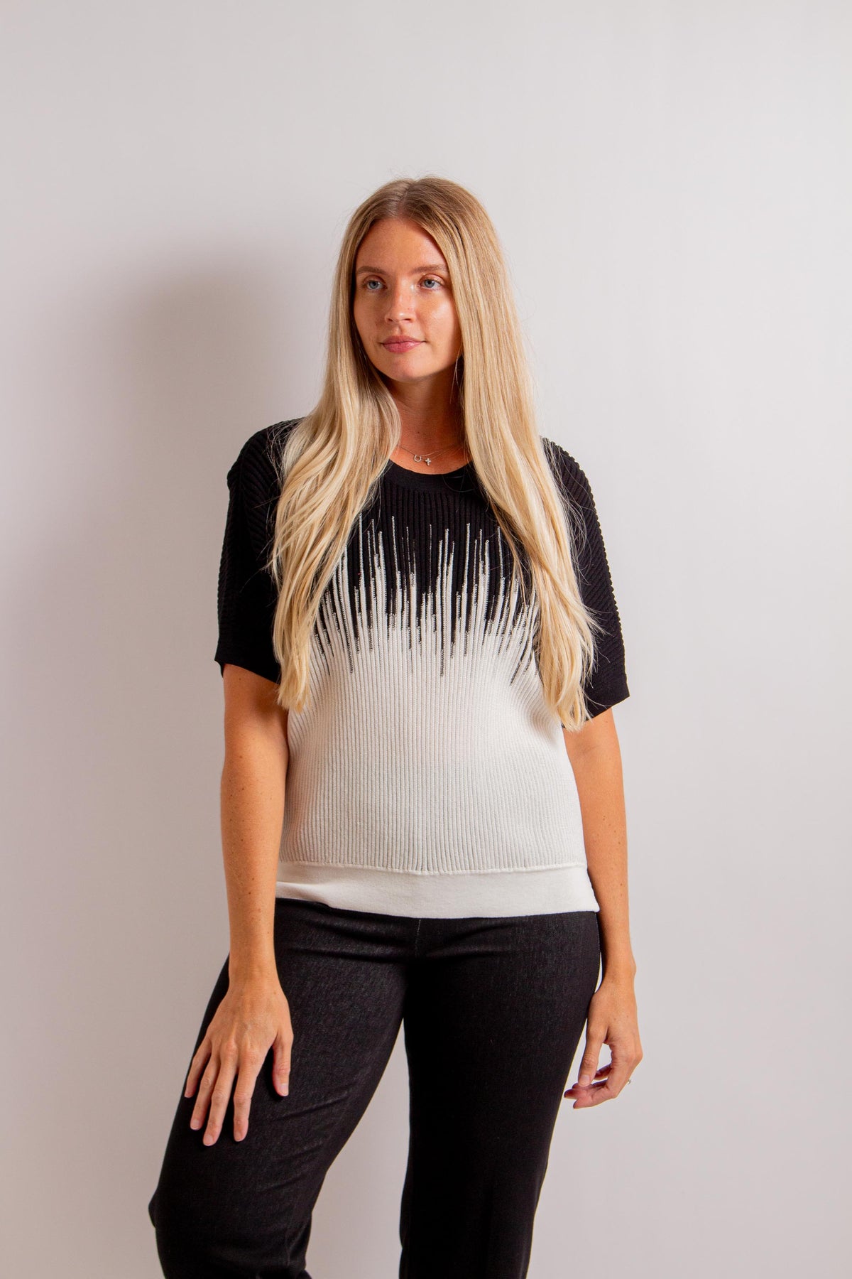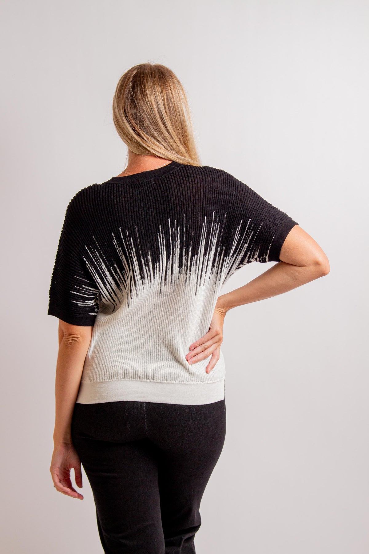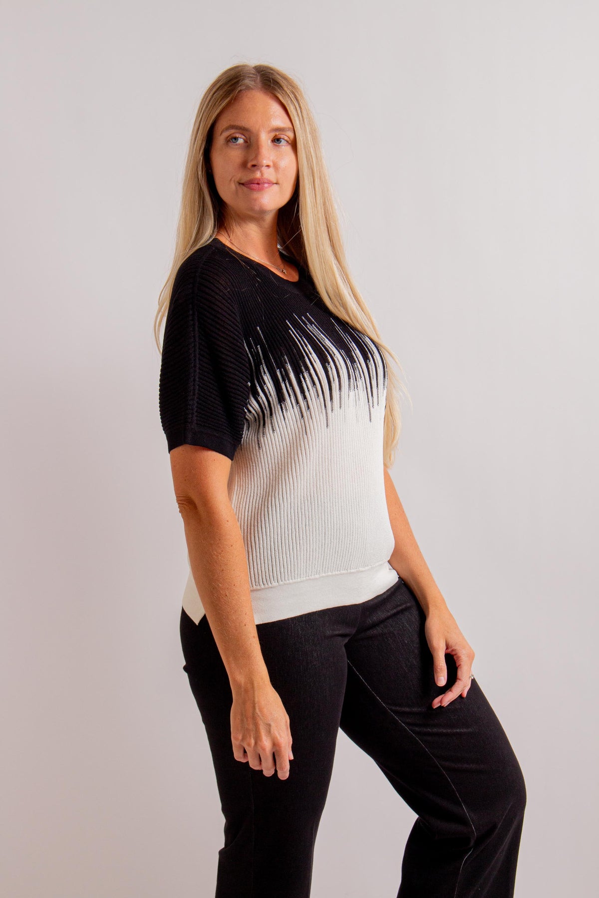 Black/ White Waterfall Design Knit Top with Scoop Neck and Short Sleeves. Fabric: 72% Viscose, 28% Nylon