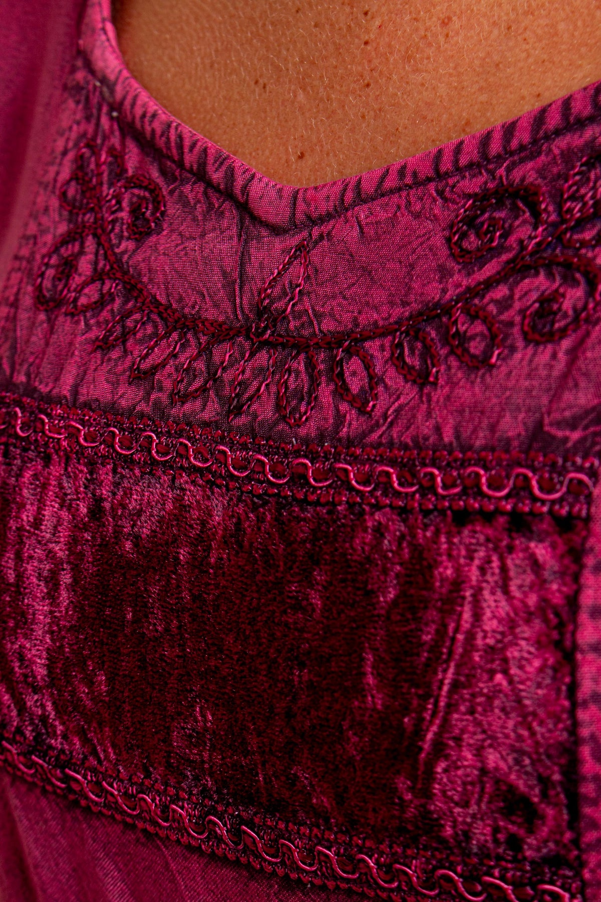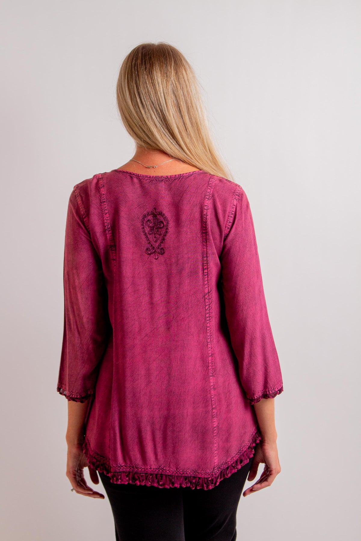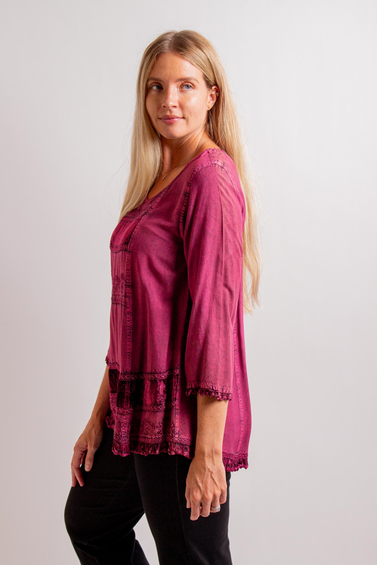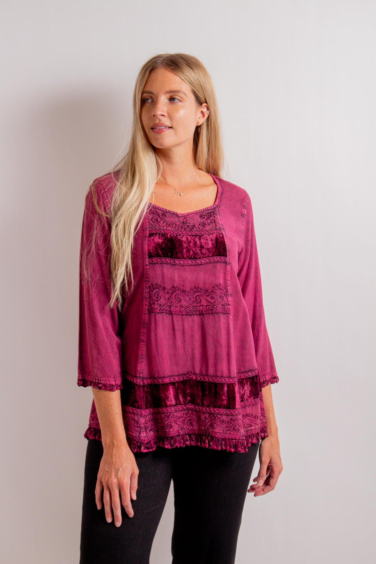 "Venus" Cranberry Top with 3/4 Sleeves, Low Scoop Neck. Fabric: 100% Rayon