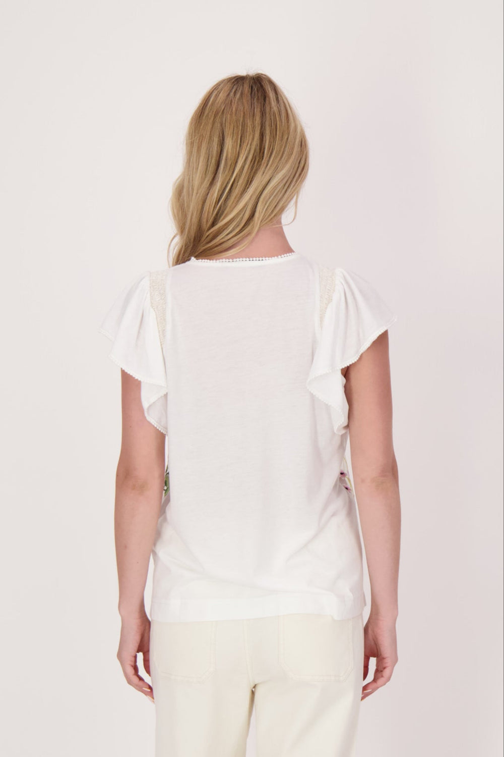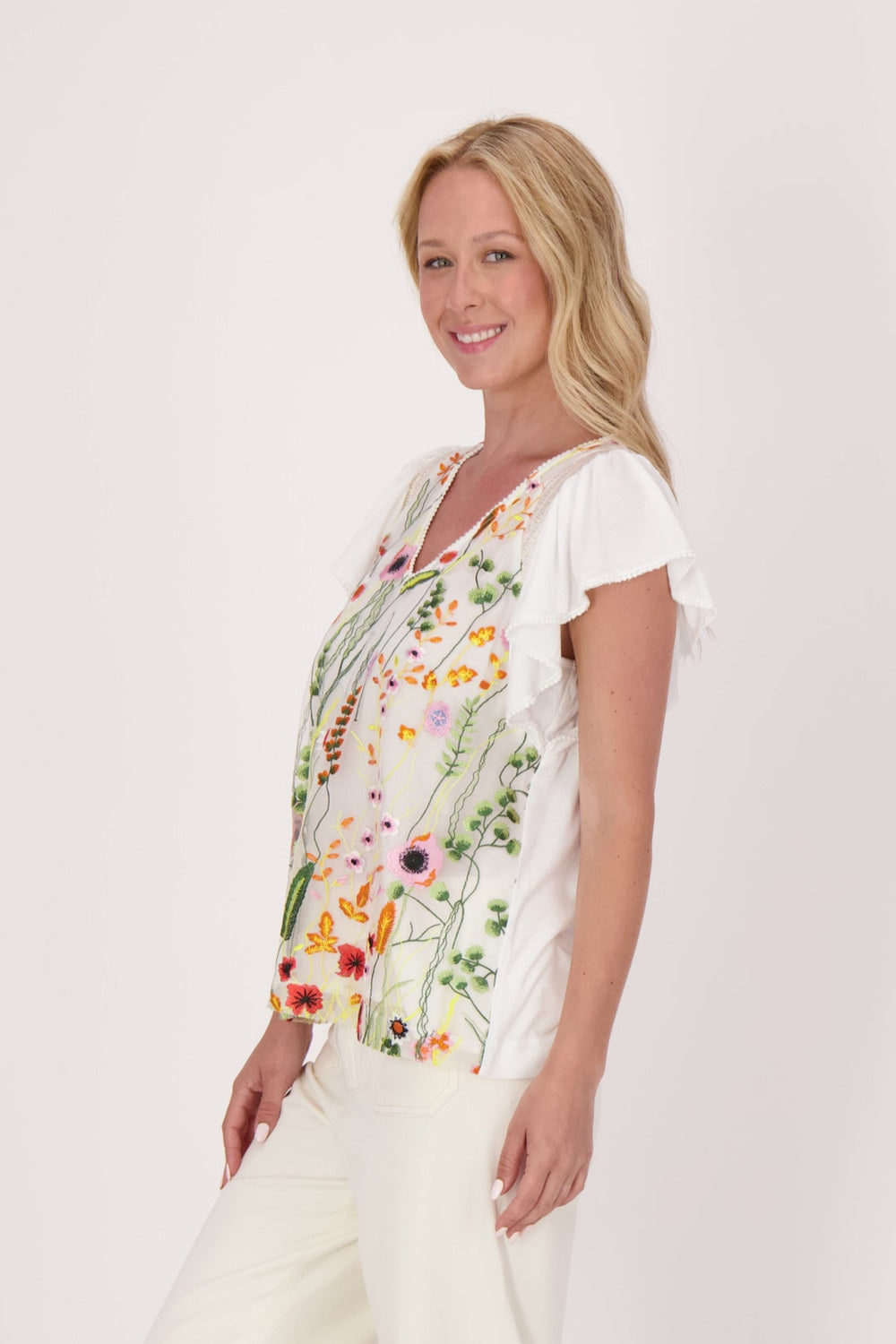 Beige Ruffle Cap Sleeve Top with Floral Embroidery. Fabric: Shell 1: 100% Polyester. Shell 2: 95% Polyester, 5% Elastane