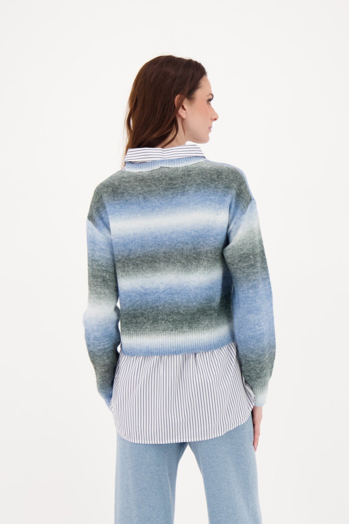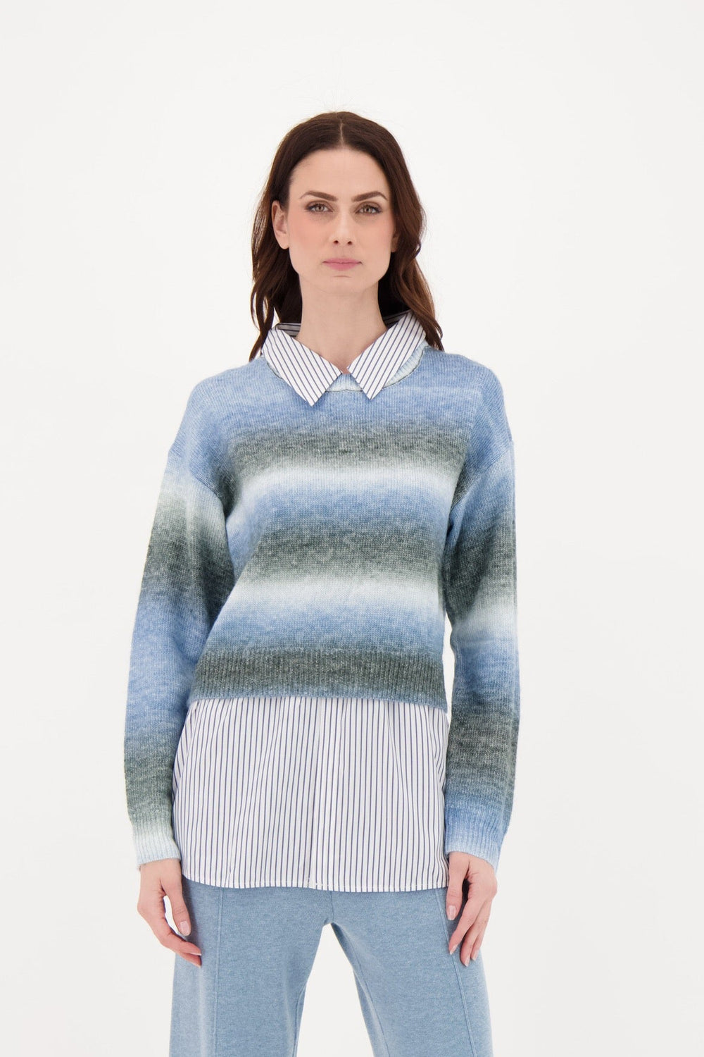 Blue Moire Sweater with Fader Stripe Collar Shirt Tail