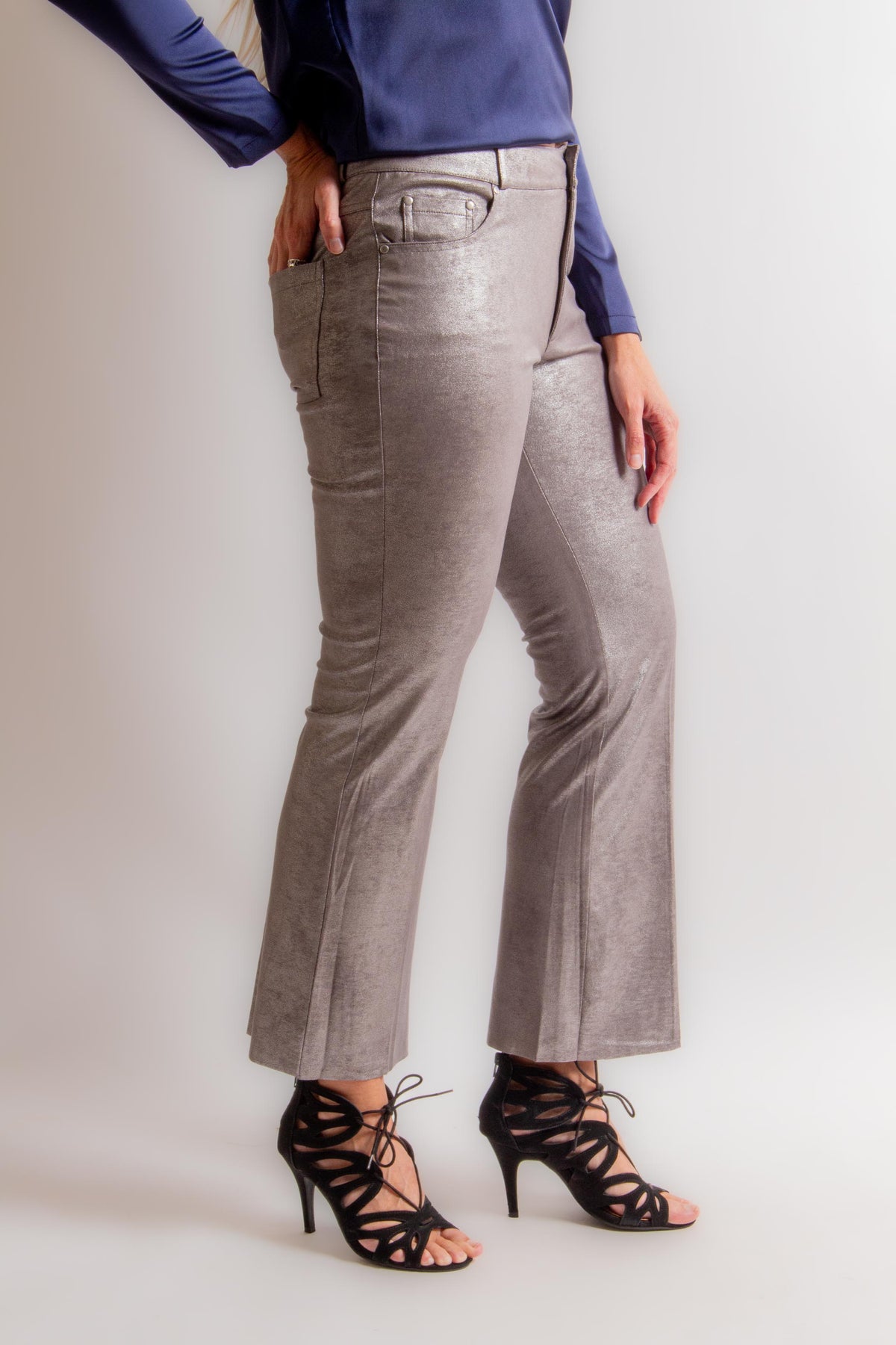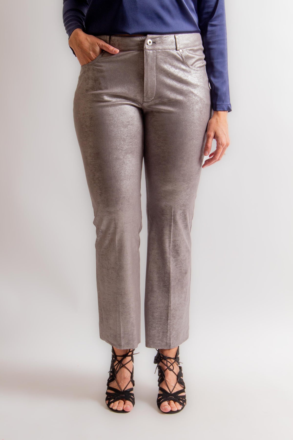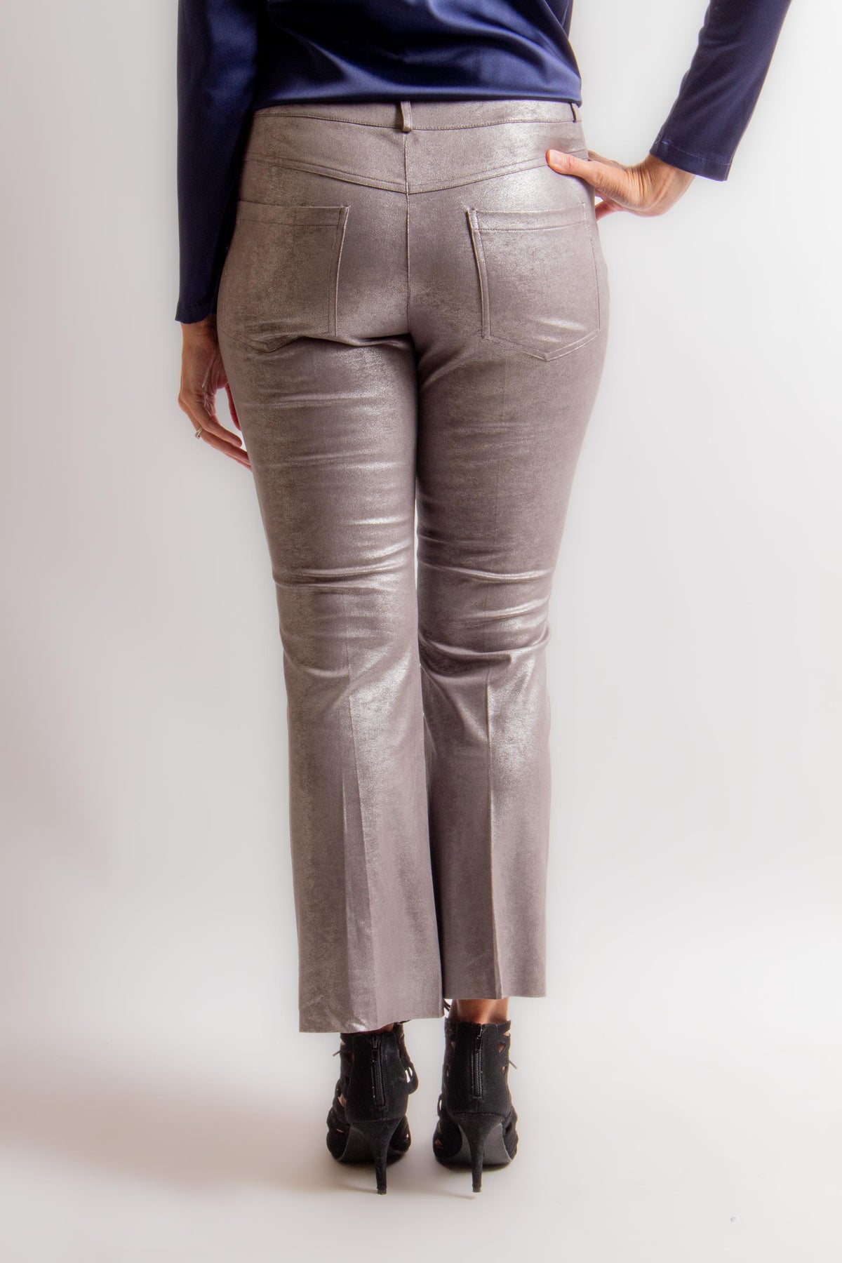 Grey Vegan Leather Distressed Metallic Pant with Front Zip and Button Fly, Front and Back Pockets. Fabric: 90% Polyester, 10% Spandex