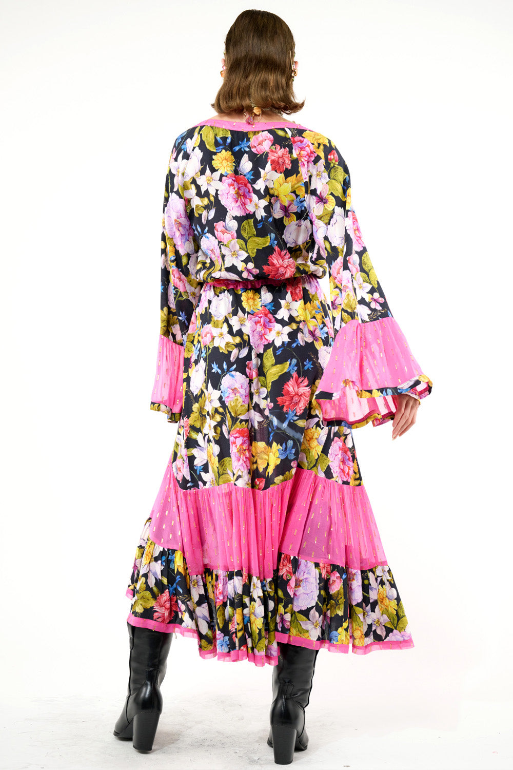 Floral print bell sleeve button-up maxi dress with contrast metallic gold dashed line chiffon sleeve ruffle and hem, layered tassels attached to drawstring