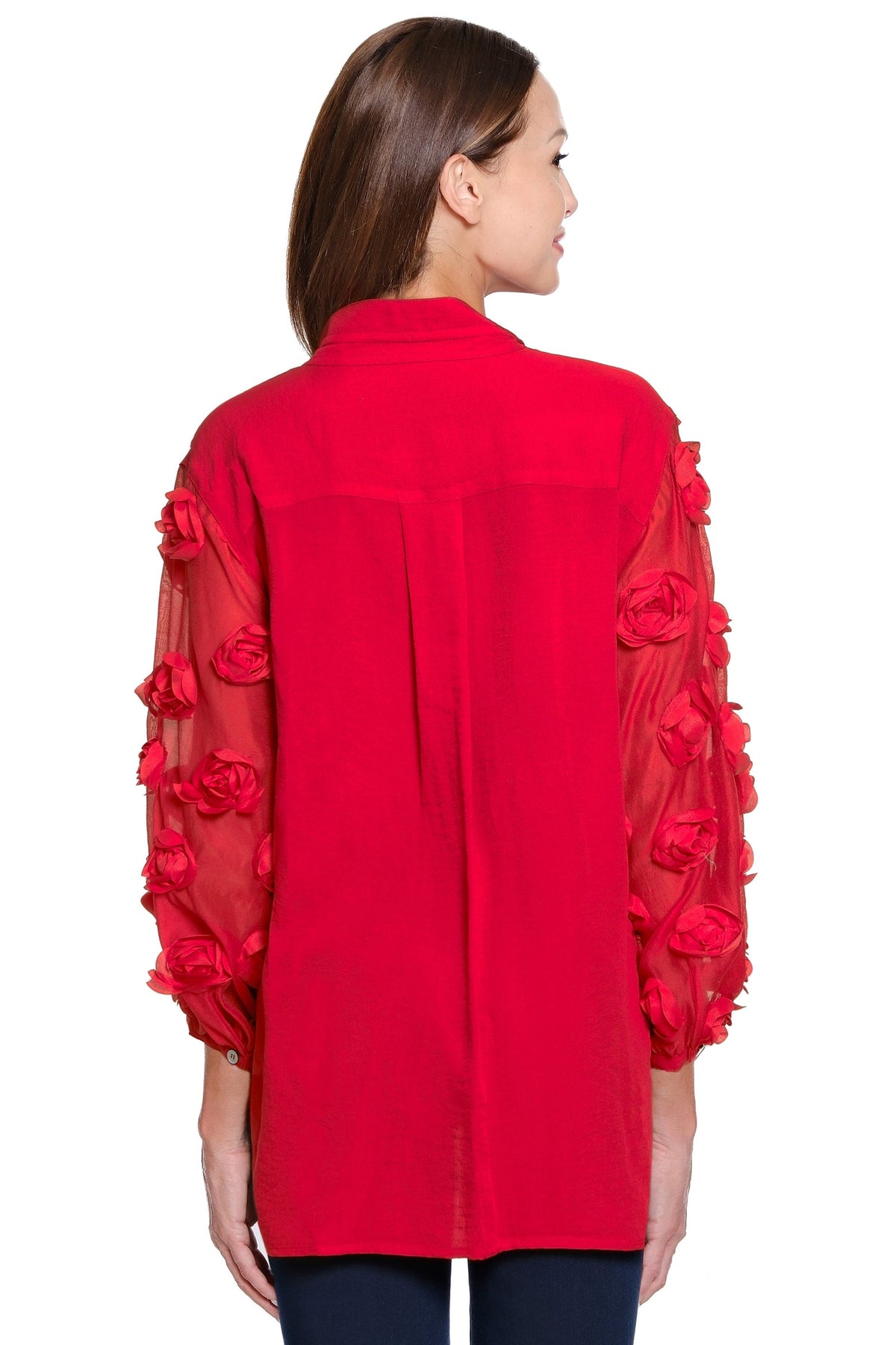 Delicate and sophisticated, this top combines textured elegance with feminine details. Crafted from a soft rayon/nylon blend, it features a structured wire collar, button-front closure, and sheer 3D rosette accents on the 3/4 sleeves for a romantic, eye-catching finish. Perfect for layering or wearing on its own, it elevates any outfit with subtle artistry.