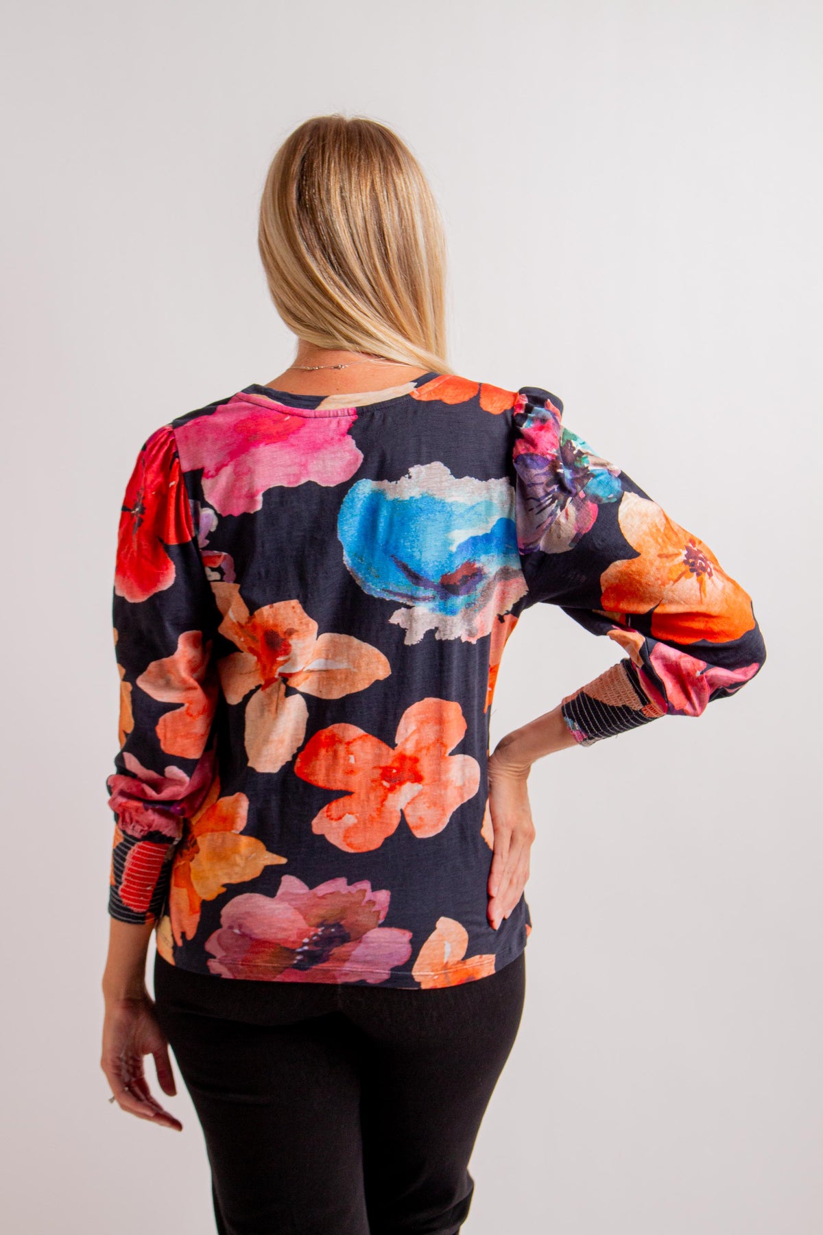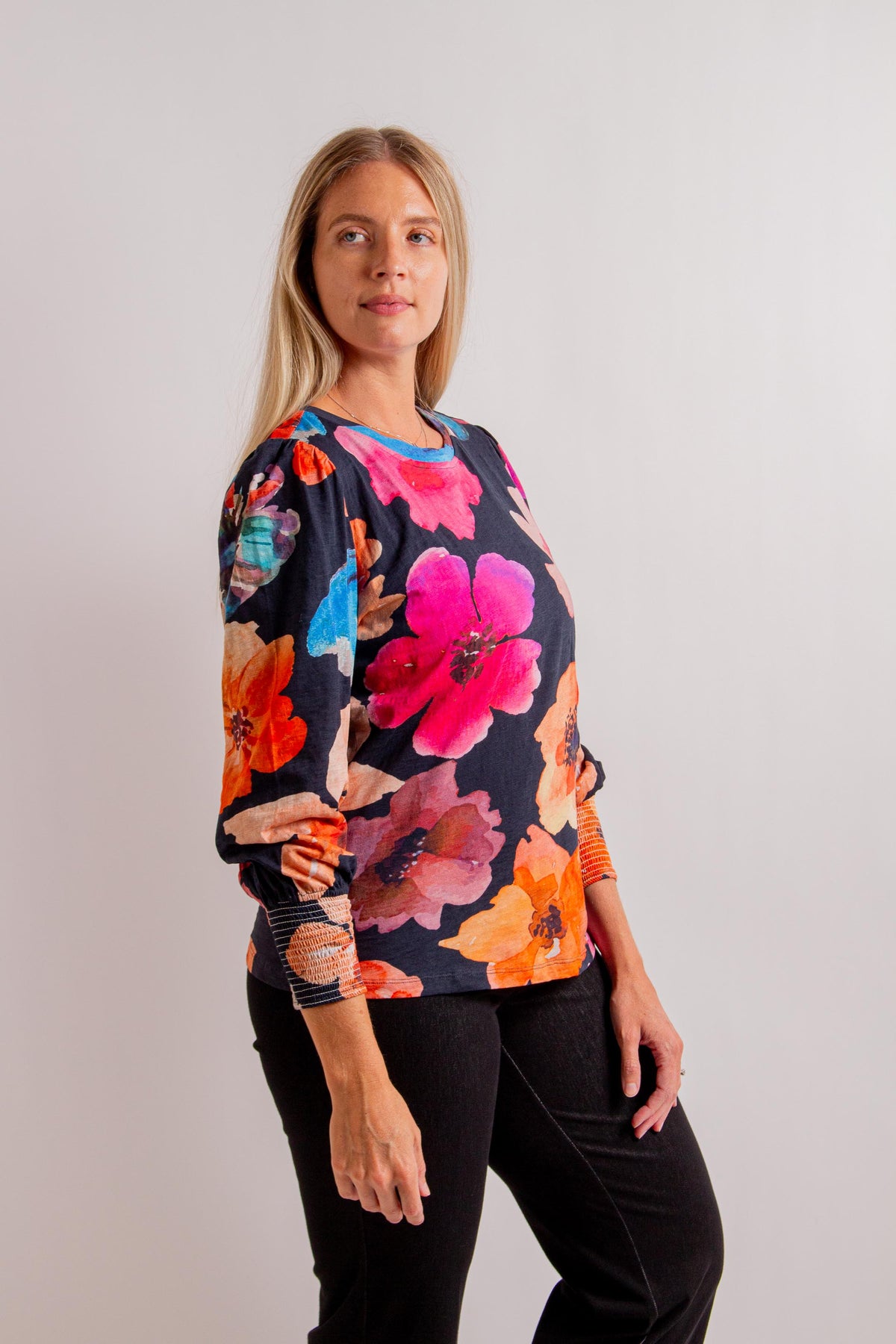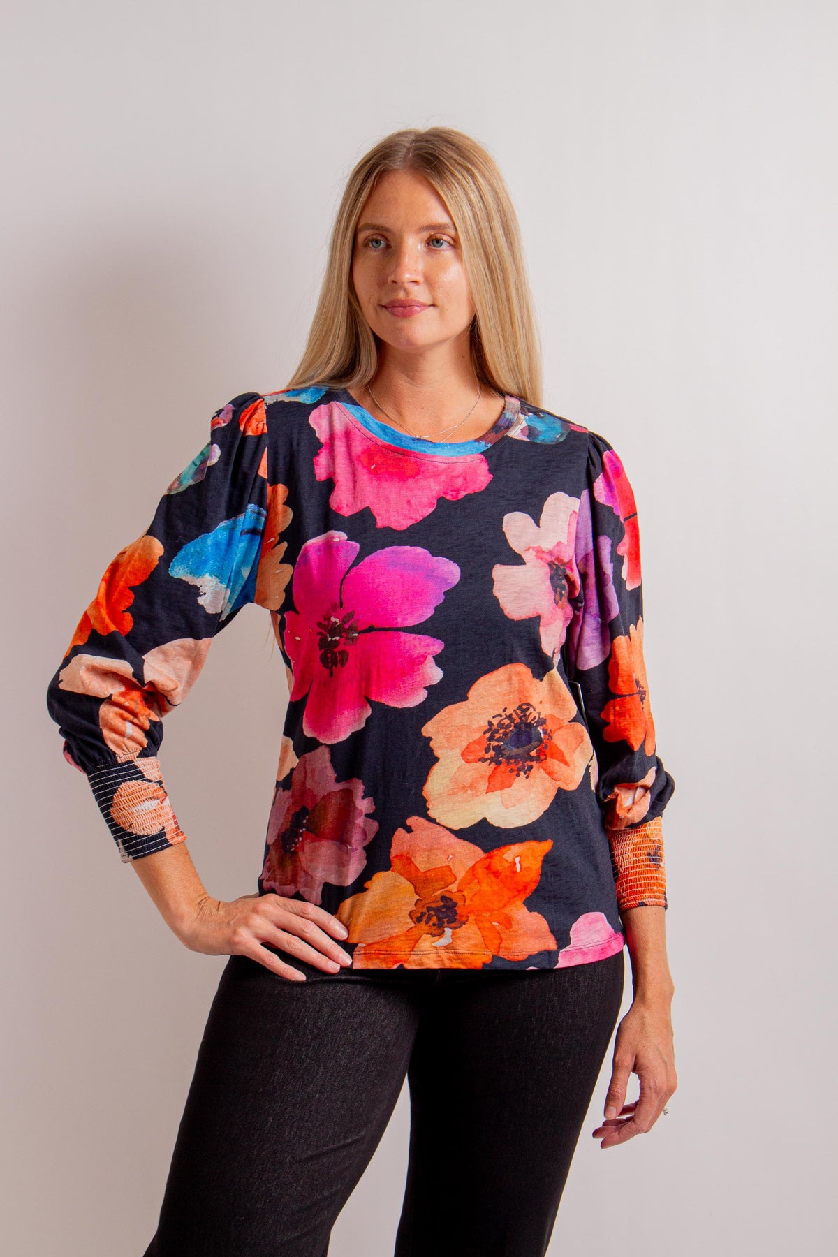 Floral Multicolor Peasant Top with Smocked Sleeve Cuff. Fabric: 100% Cotton