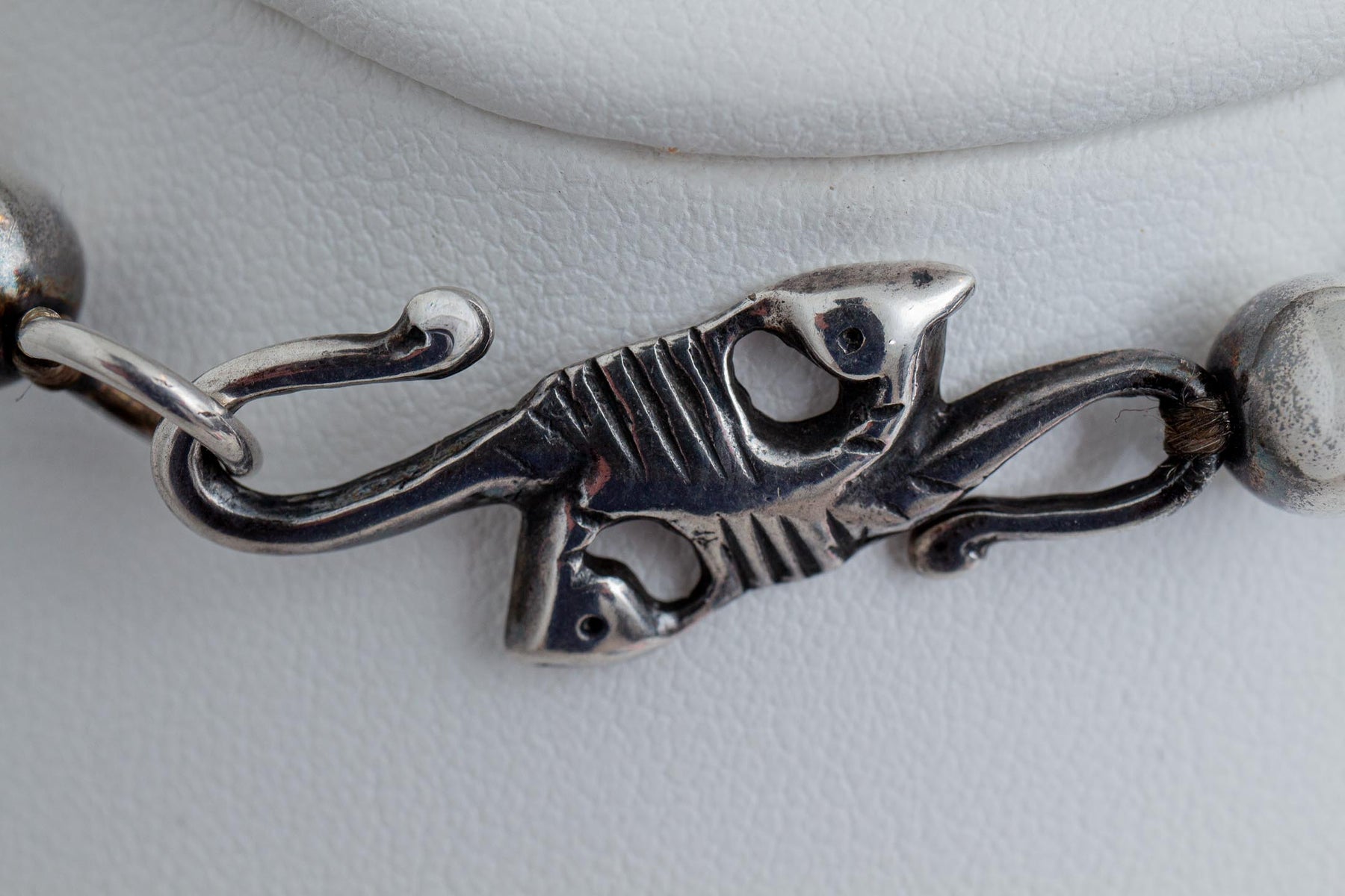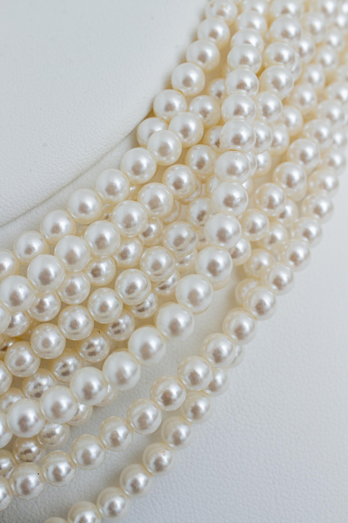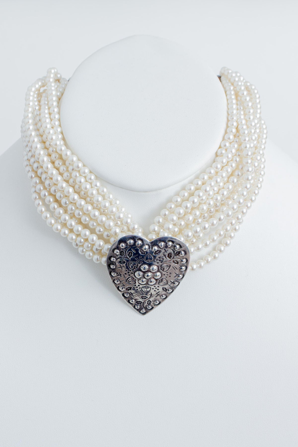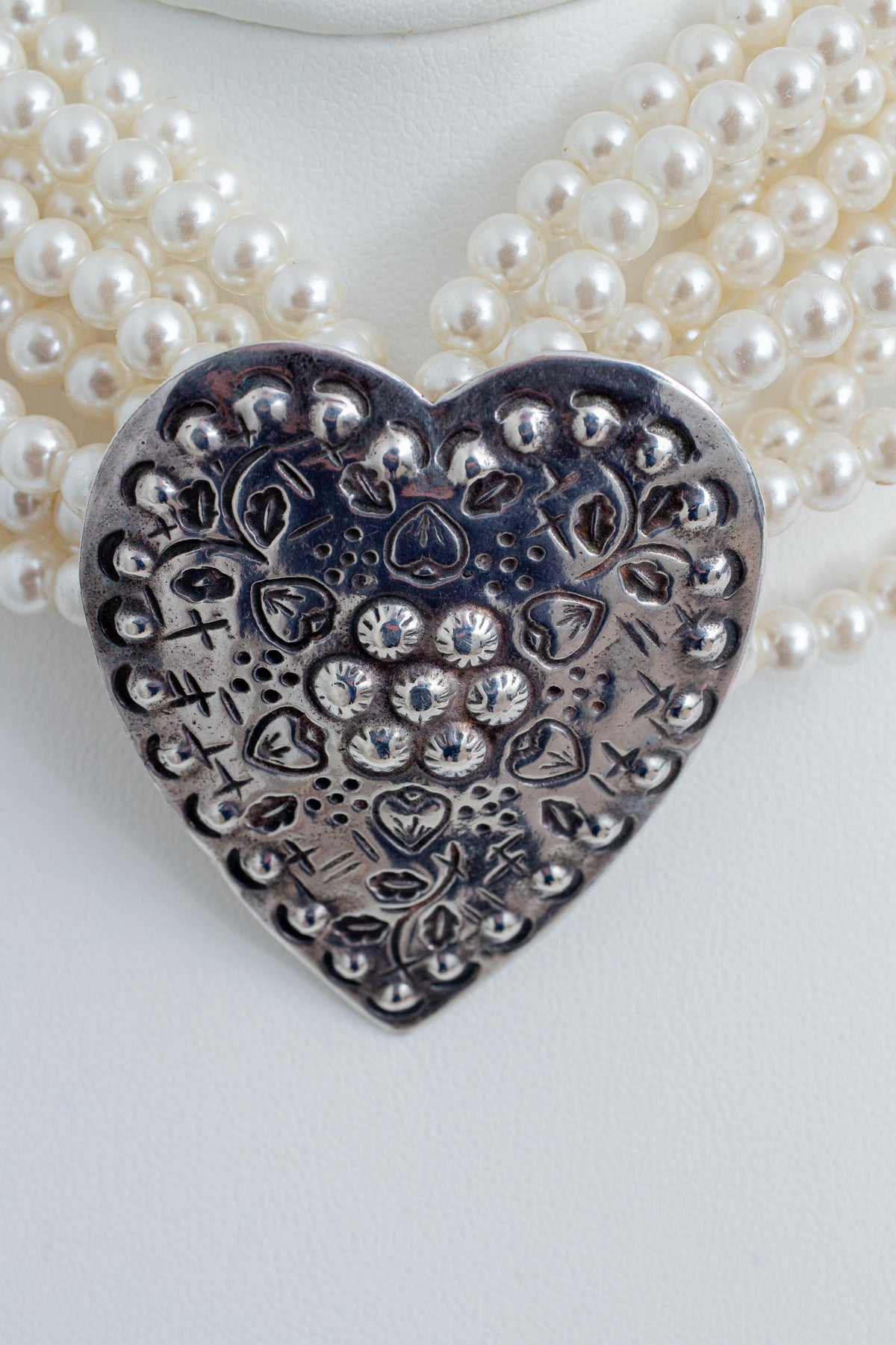 Vintage Multi Strand Faux Pearl Choker Necklace with Heart Shaped Reproduction of 19th Century Repousse` Luggage Tag Pendant with Sterling Silver Clasp and Beads.