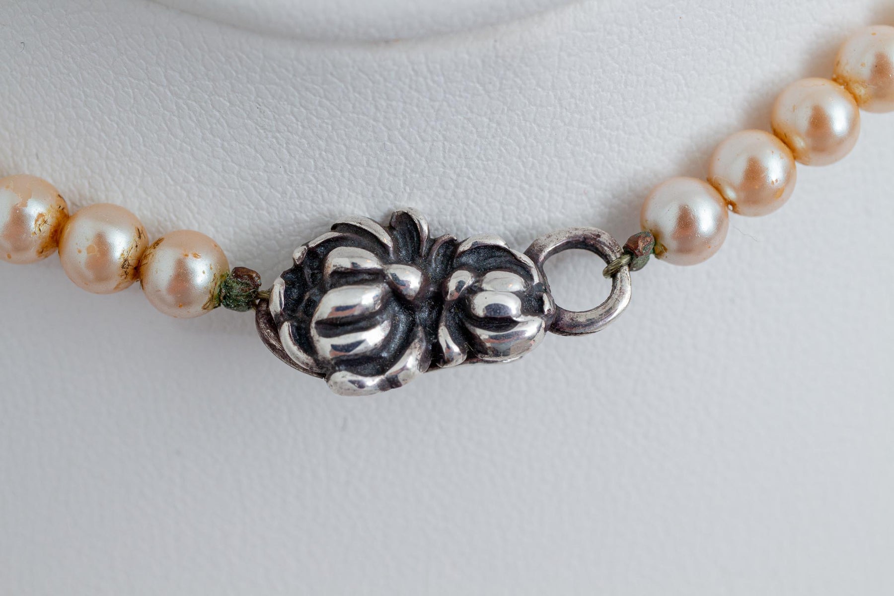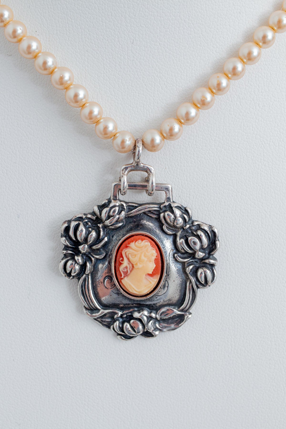 Vintage Faux Pearl Necklace w/ Reproduction of 19th Century Repousse` Luggage Tag Pendant with Center Coral Cameo in Sterling Silver By Foree Hunsicker (Stamped Foree 925)