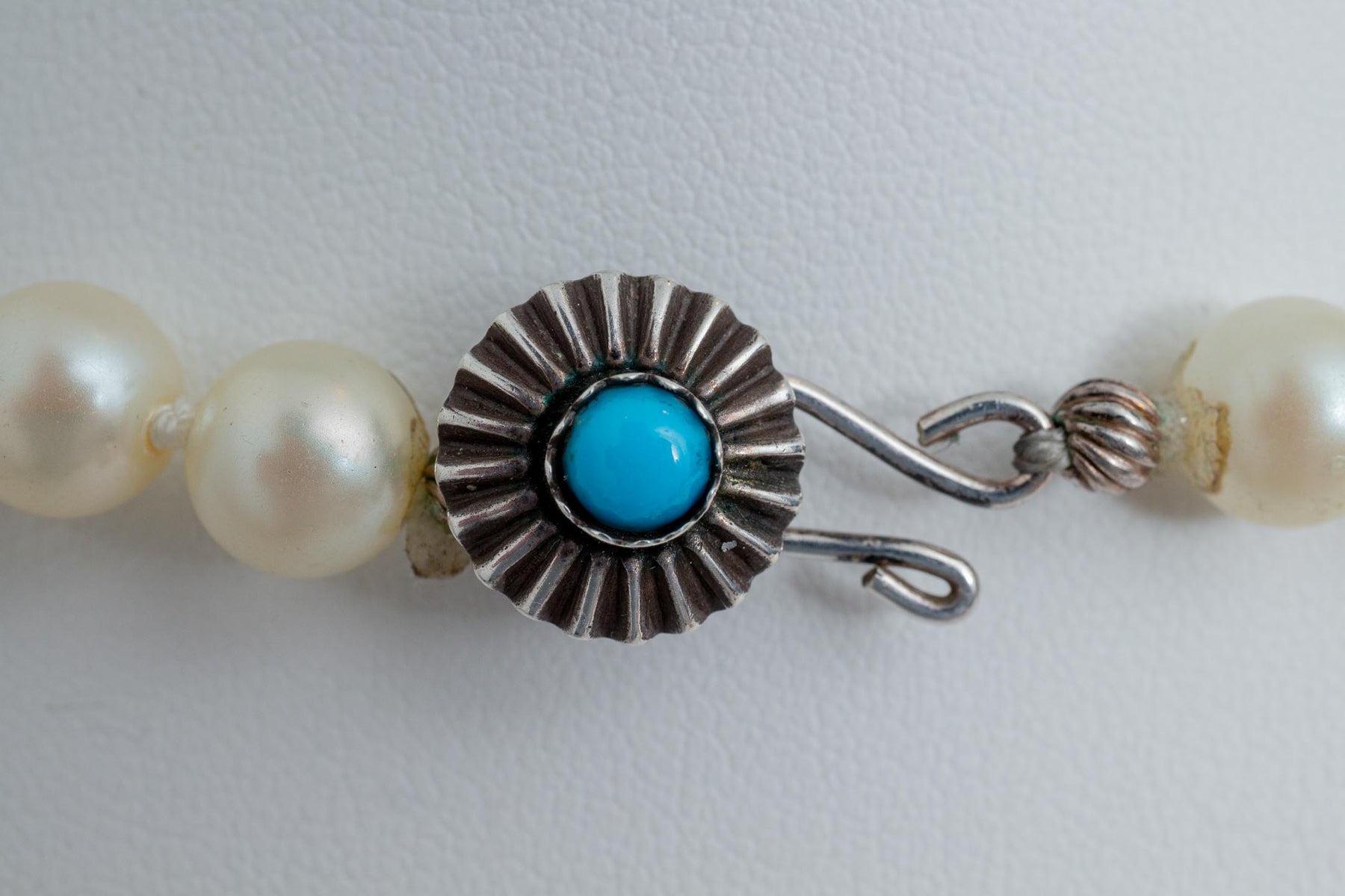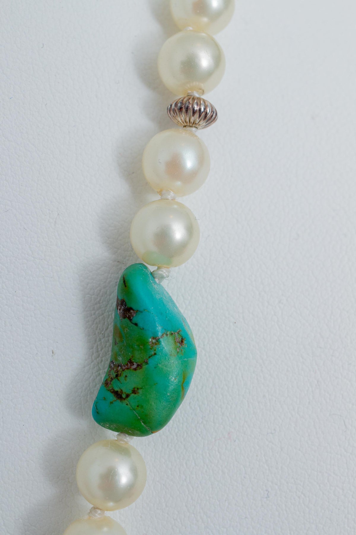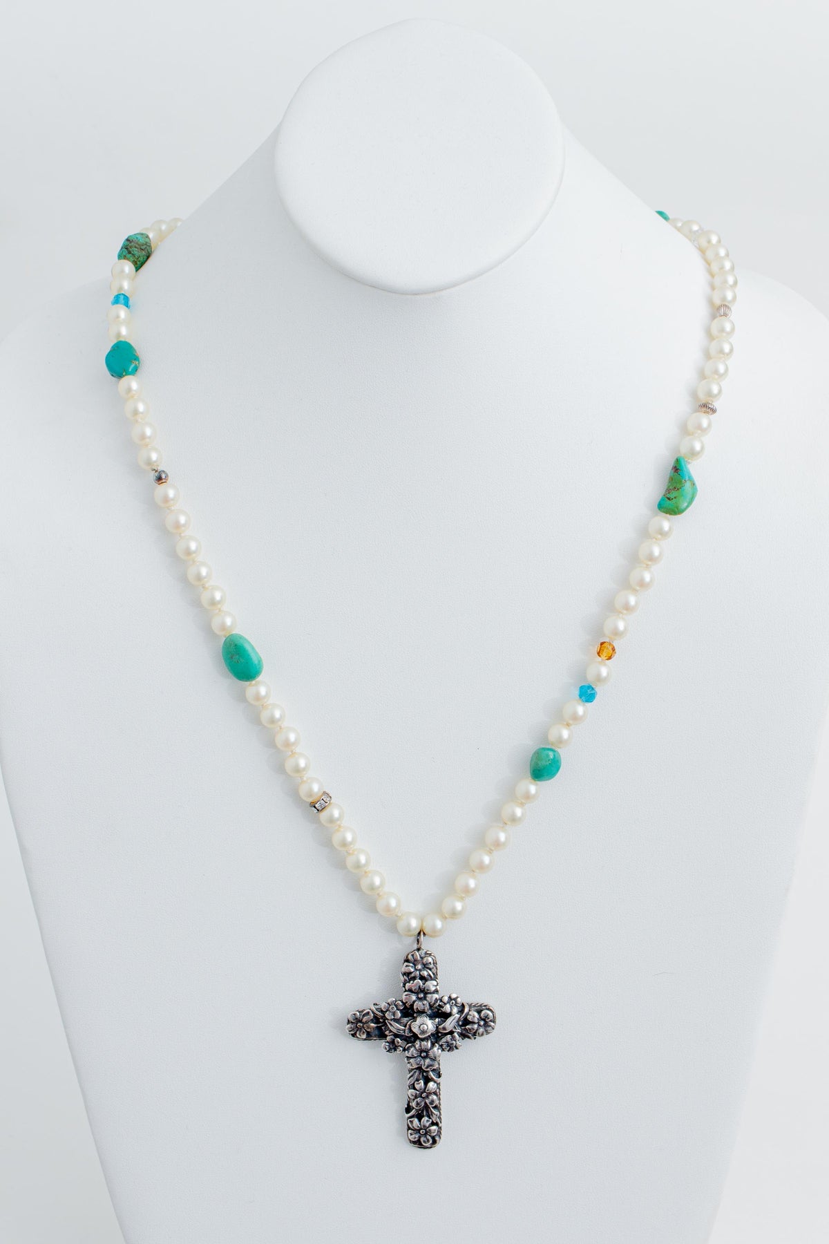 Vintage Victorian Style Faux Pearl Necklace with Real Turquoise Stones, Multicolor Crystal Beads, Sterling Silver Beads and Clasp. Featuring a Beautiful Sterling Silver Cross with Floral Motif.