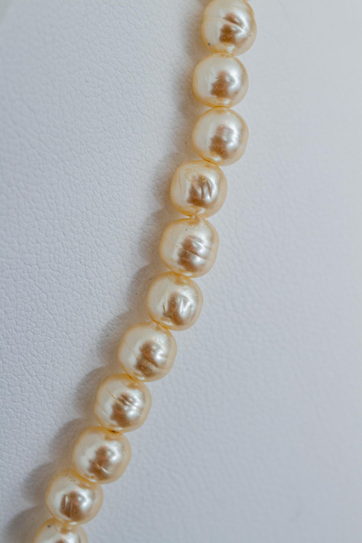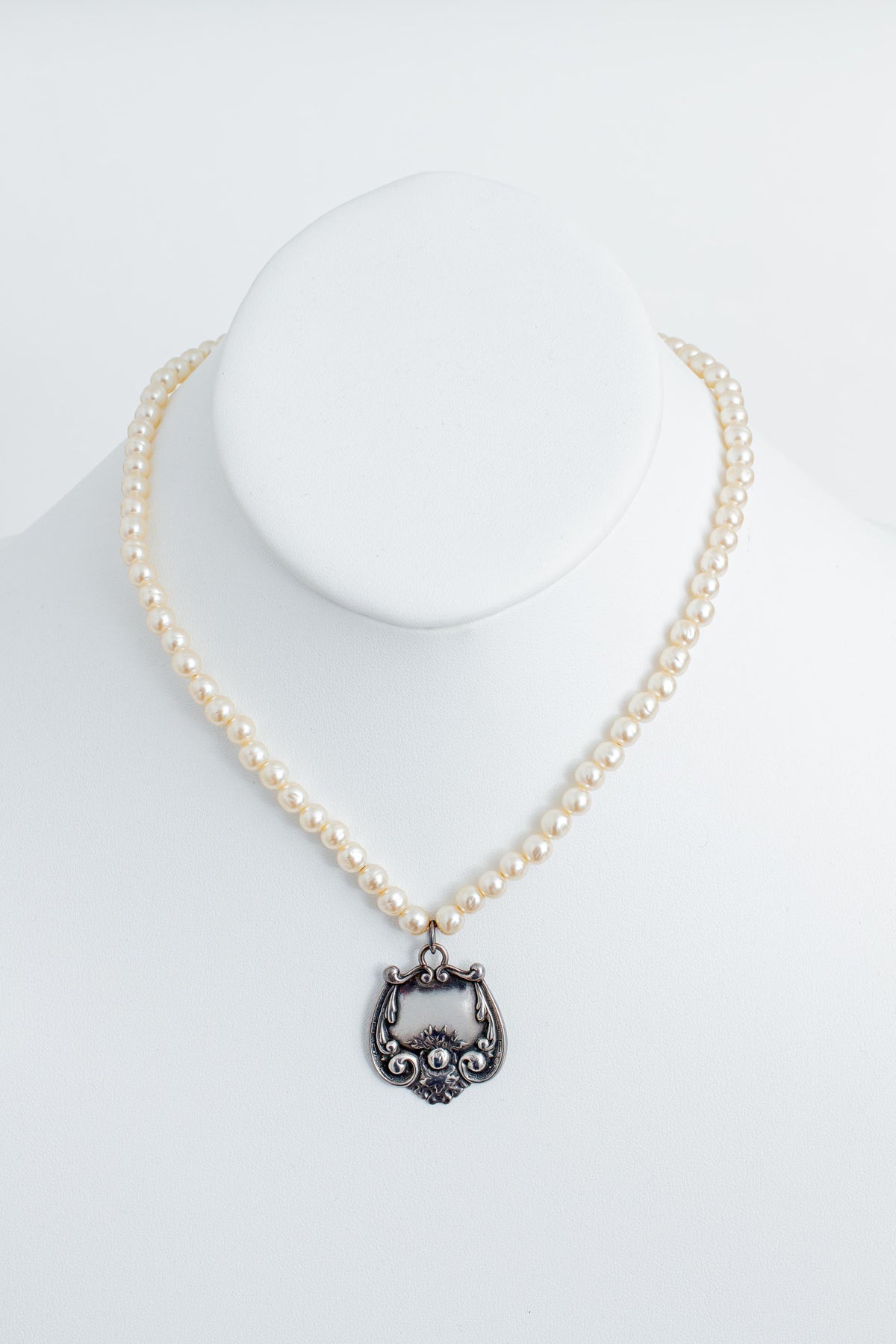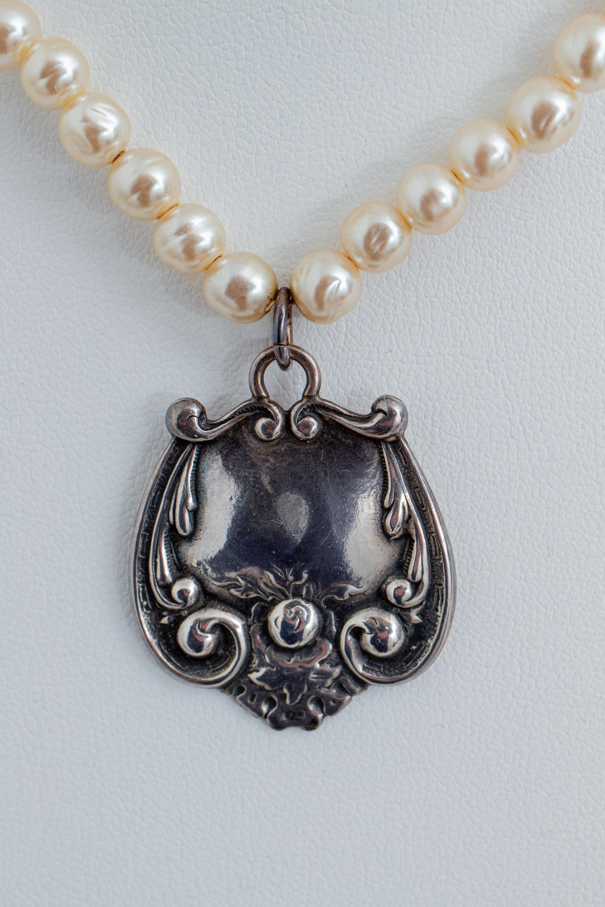 Vintage Faux Pearl Necklace with Reproduction of 19th Century Repousse` Luggage Tag Pendant in Sterling Silver by Foree Hunsicker (Stamped Foree 925)